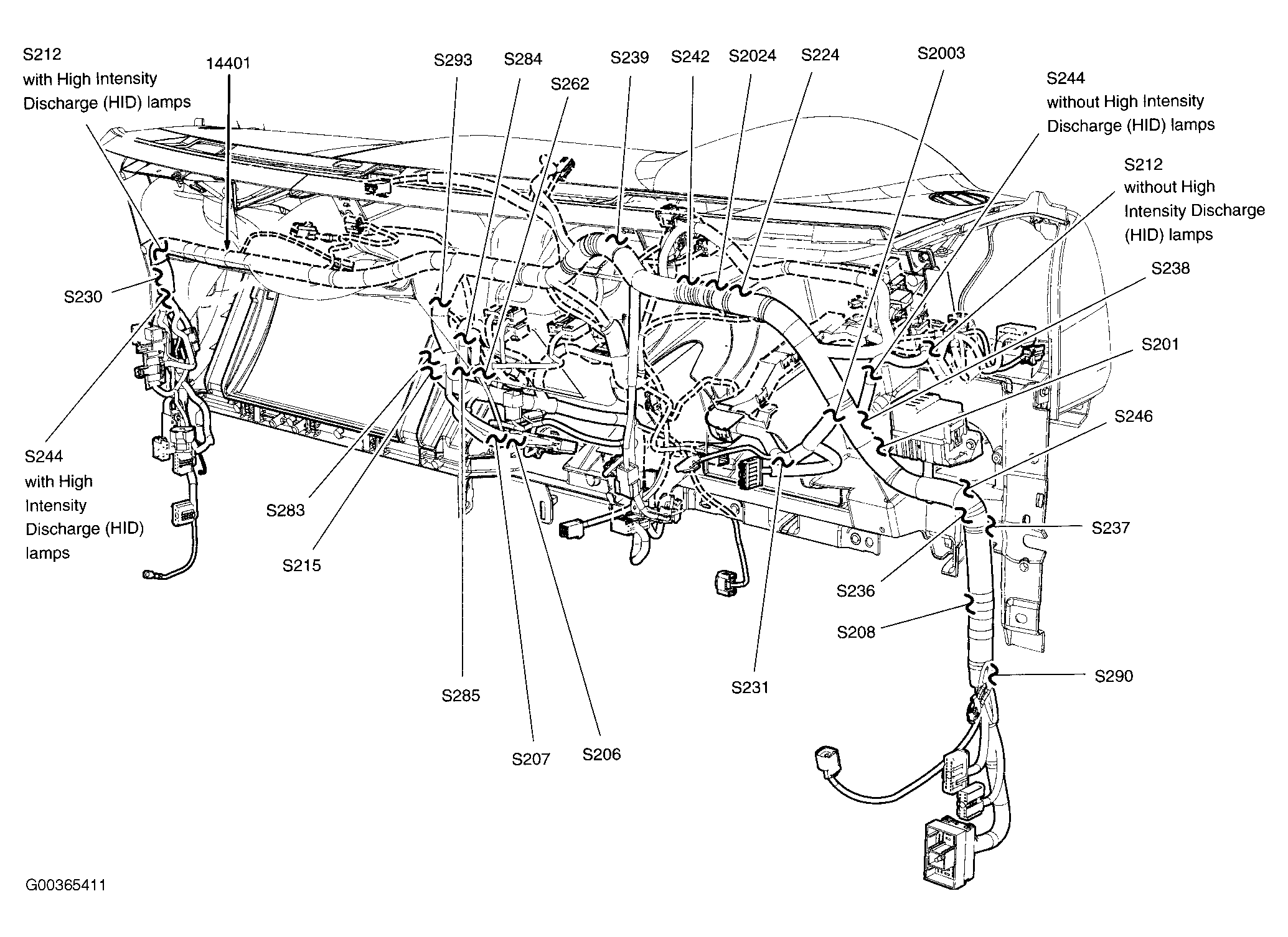 | S244 (W/HID Lamps) | In main harness, near breakout to right side of dash. See Figure. |