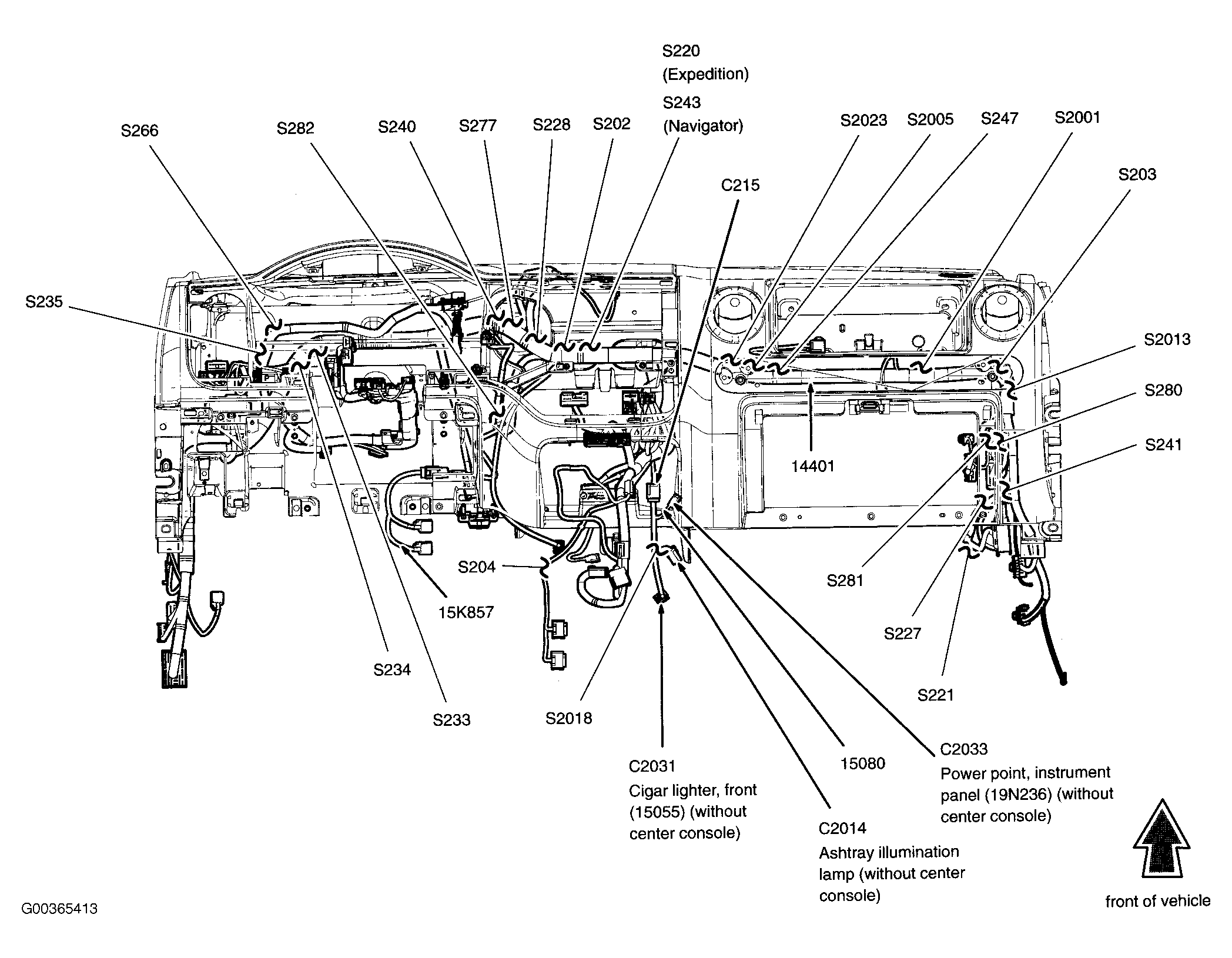 | S390 (Expedition) | In console panel harness, near breakout to center console. See Figure. |