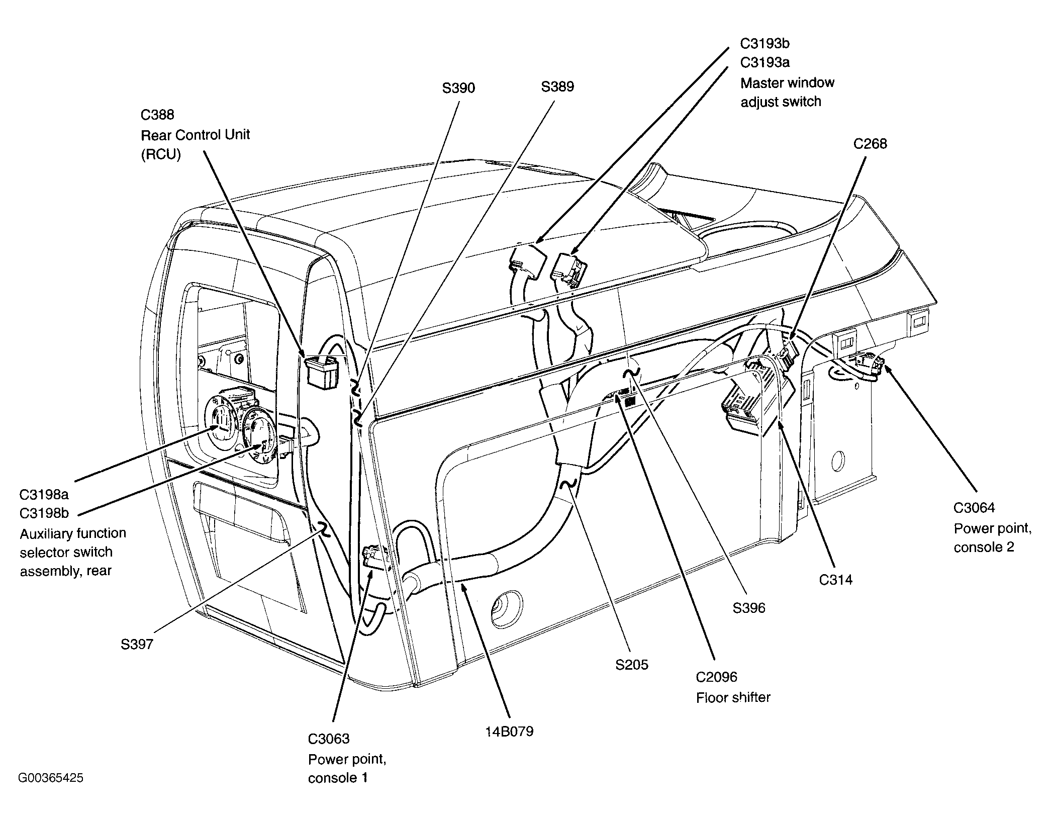 | S397 | In console panel harness, near breakout to rear of center console. See Figure. |