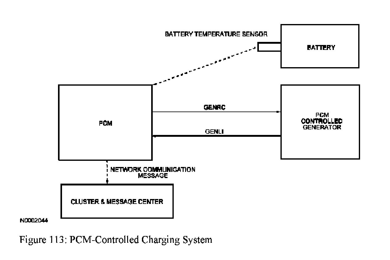 The PCM-controlled charging system provides many additional benefits over the current integral generator regulator system. The first benefit is improved battery life. In an integral generator regulator system the regulator set point is established by a temperature sensor in the regulator which estimates battery temperature. In a PCM-controlled charging system the regulator voltage set point is determined by the PCM and communicated to the regulator through the generator regulator control (GENRC) circuit. The PCM uses an algorithm to estimate battery temperature. Improving baffery temperature estimates will reduce battery damage caused by over- and undercharging.