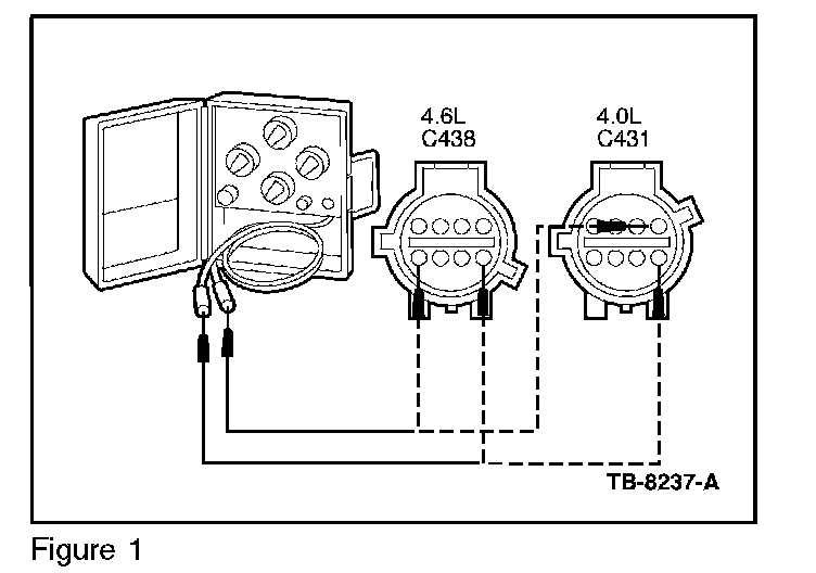 4. On the vehicle harness side of the connector, connect one lead of an instrument gauge system tester (Rotunda # 014-R1063 or equivalent) to Circuit 1356 (LG/VT - Pin-8 in Connector C438 and C431) and the other lead to Circuit 1357 (LB/YE - Pin-5 in C438 for 4.6L or Pin-4 in C431 for 4.0L) (Figure 1).