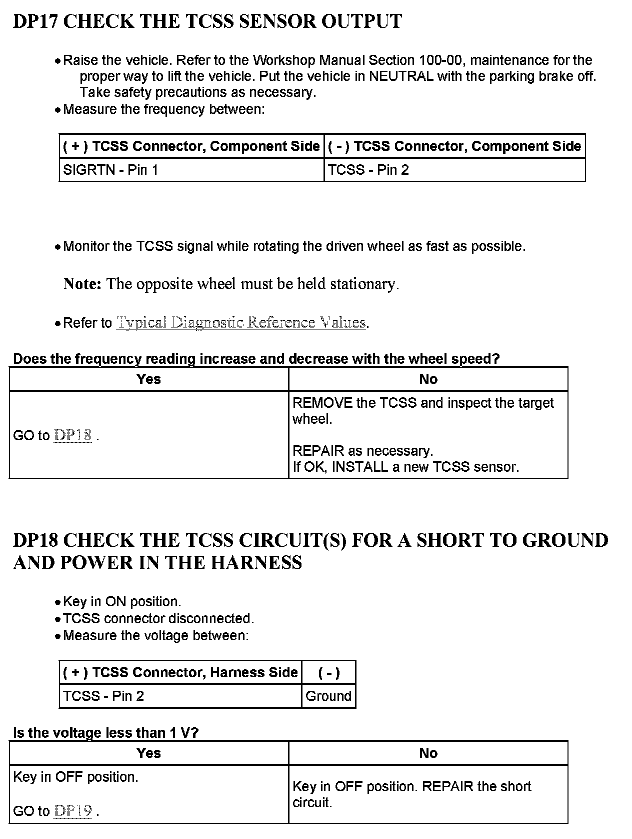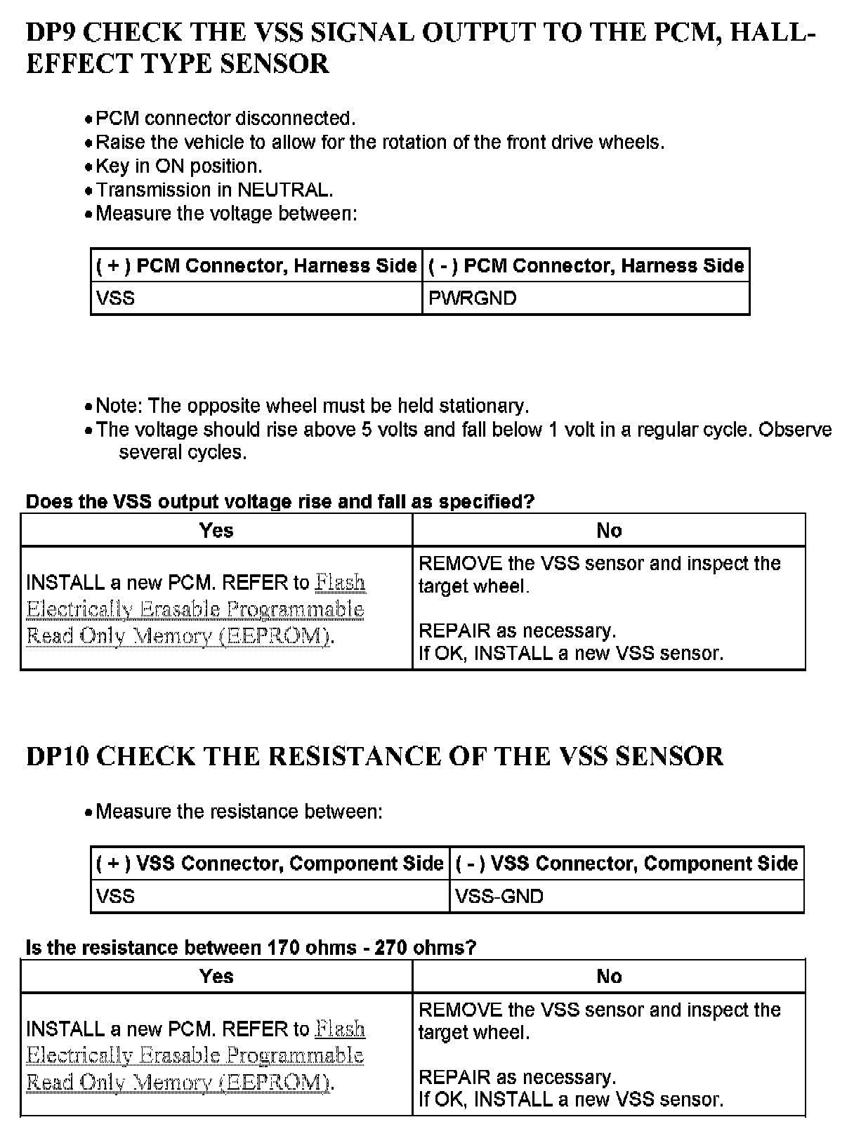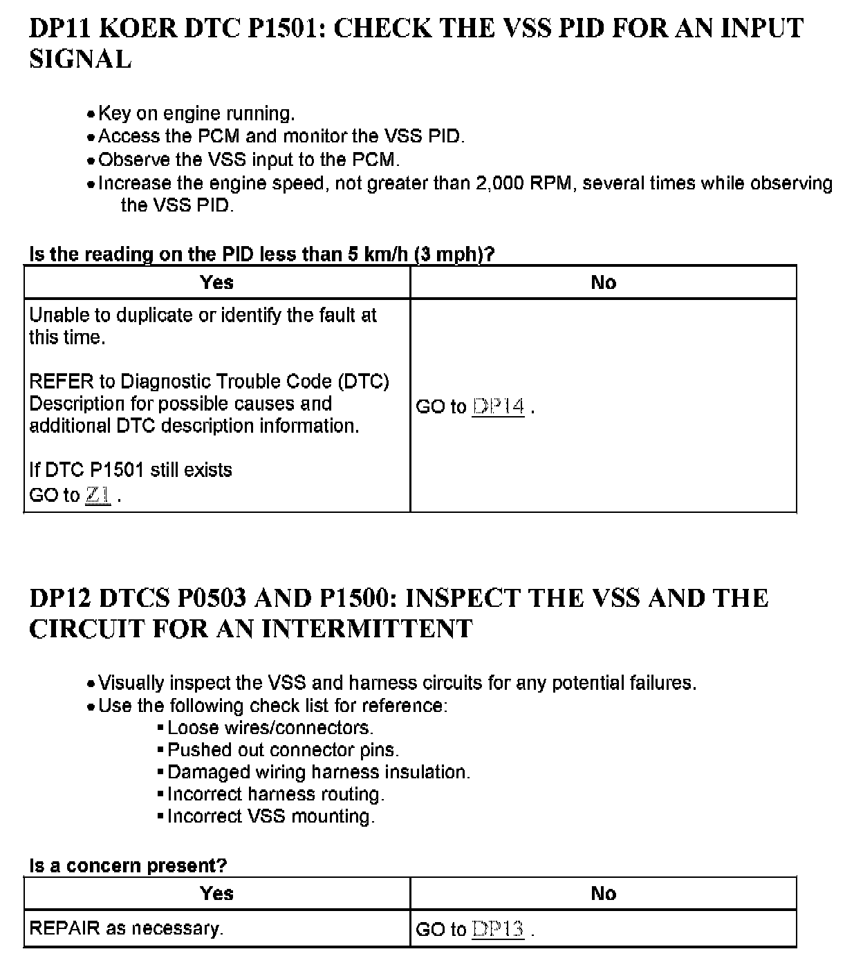Home >> Ford >> 2005 >> Focus L4-2.3L VIN Z >> Repair and Diagnosis >> Powertrain Management >> Computers and Control Systems >> Testing and Inspection >> Pinpoint Tests >> Tests DP: Vehicle Speed Sensor (VSS)/Transfer Case Speed Sensor (TCSS)