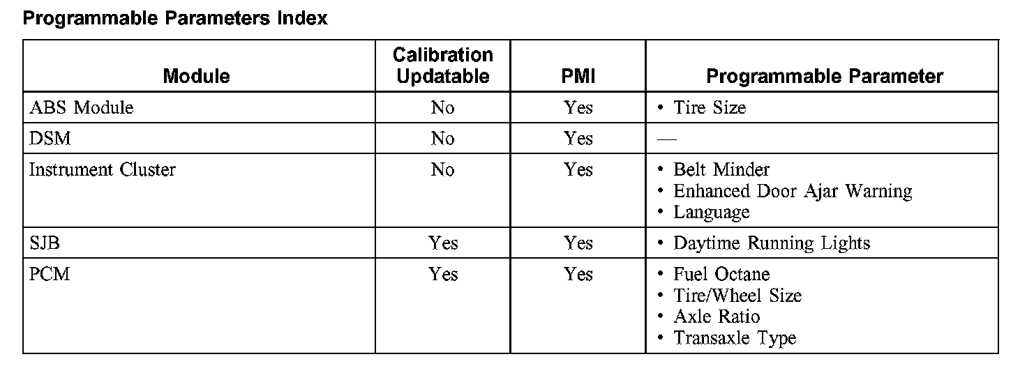 Programmable Parameters Index: