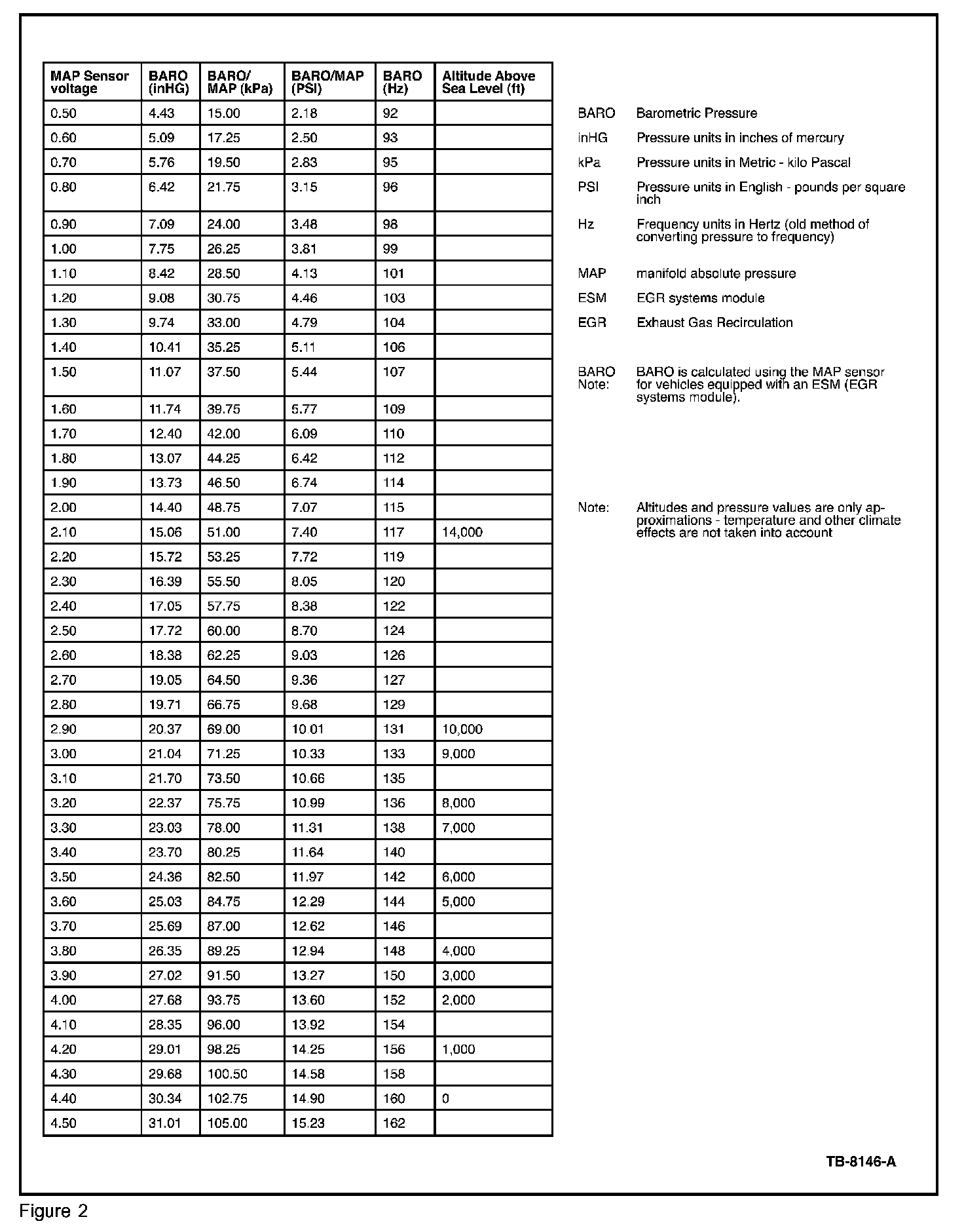 THE BAROMETRIC PRESSURE/MAP SENSOR REFERENCE CHART CONTAINED IN THIS TSB SHOWS THE ESM'S MAP SENSOR VOLTAGE CORRESPONDING TO A BARO READING IN INCHES OF MERCURY (IN-HG) AND IN HERTZ (HZ). THE CONVERSION TO KILO PASCALS (KPA) AND POUNDS PER SQUARE INCHES (PSI) ARE ALSO PROVIDED IN THE CHART.