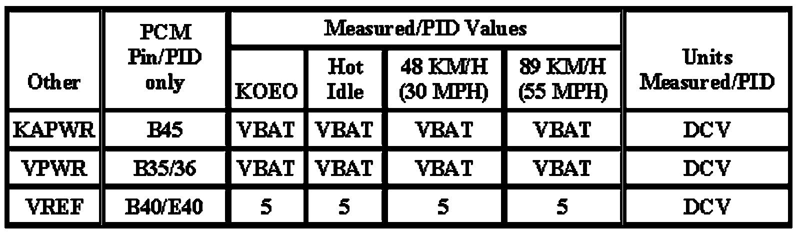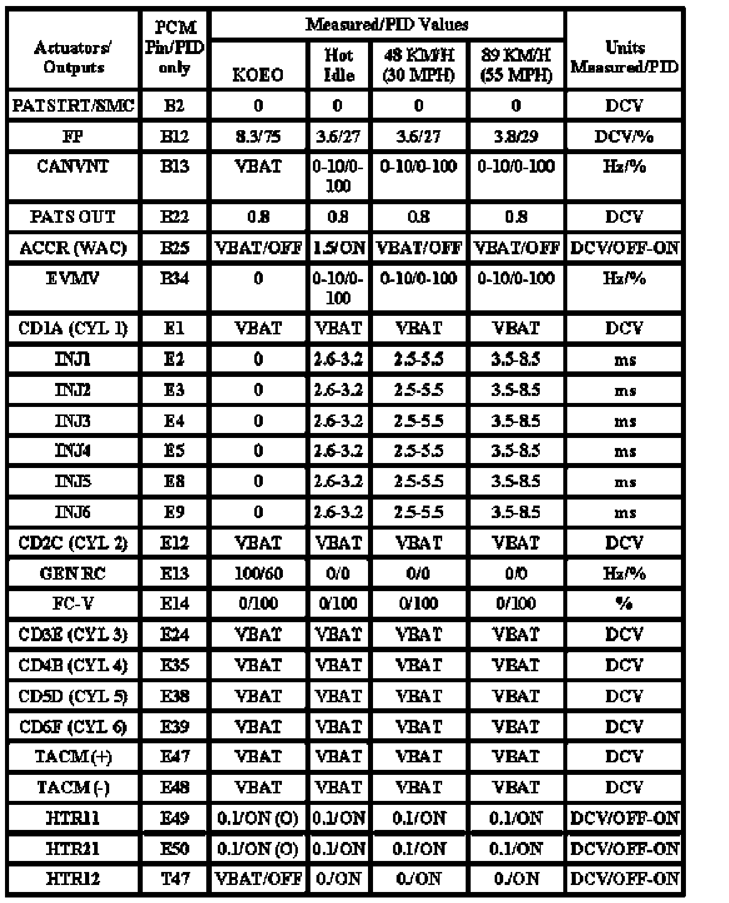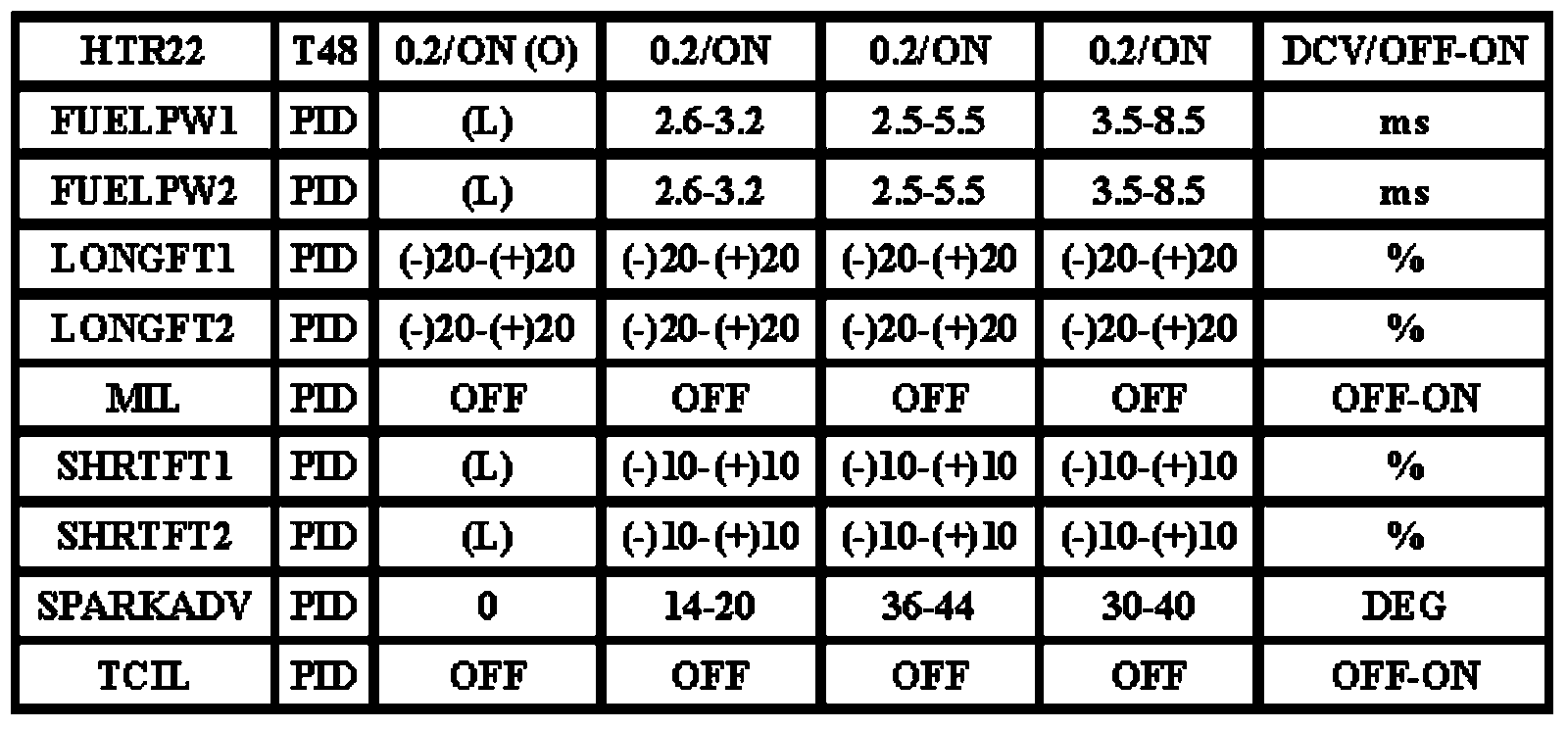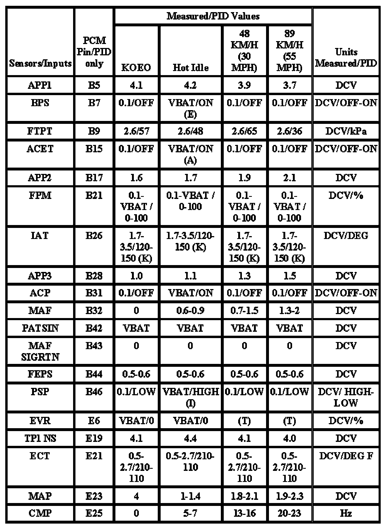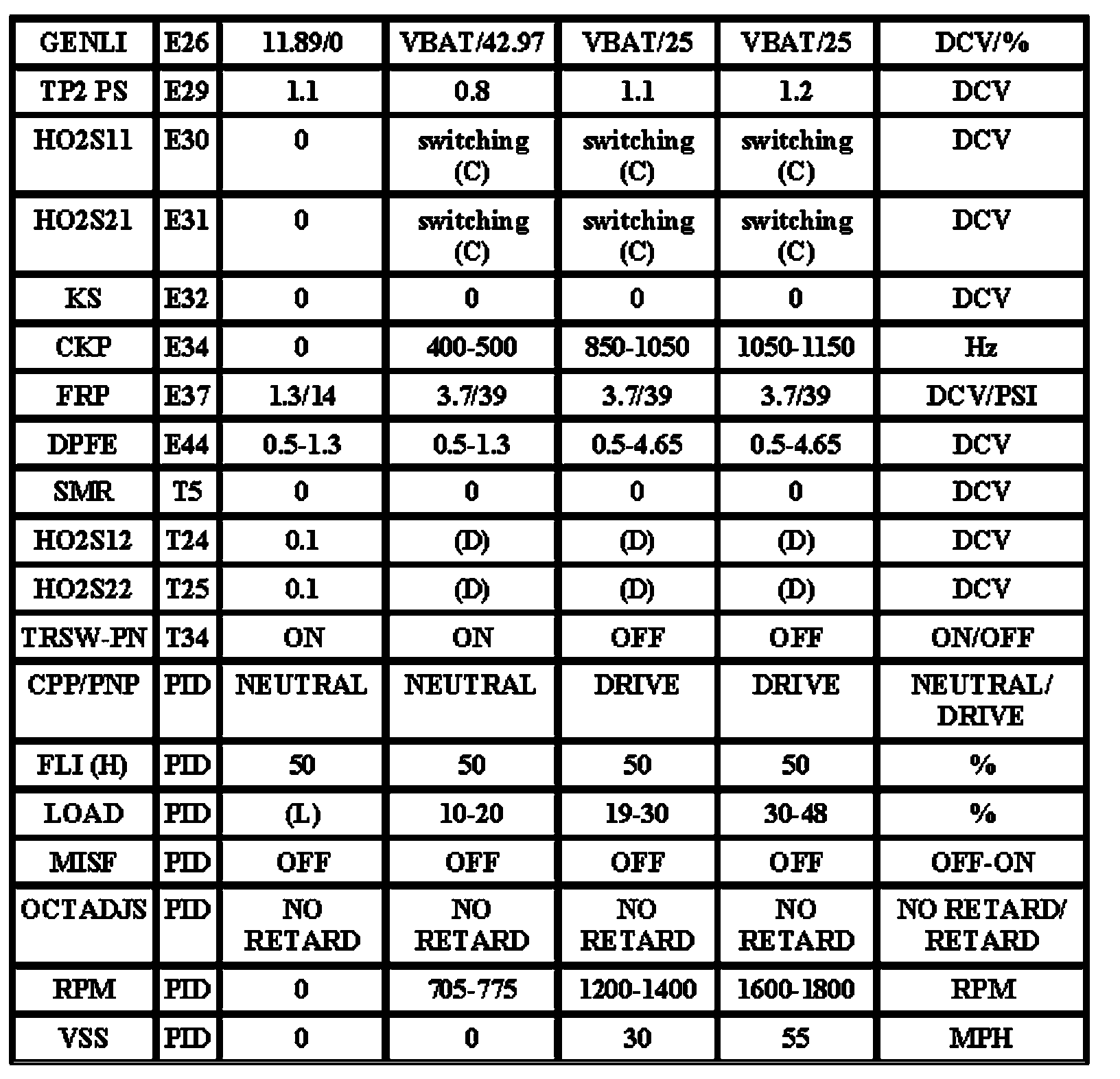 Note: All generic OBD readings under no load (PARK or NEUTRAL).