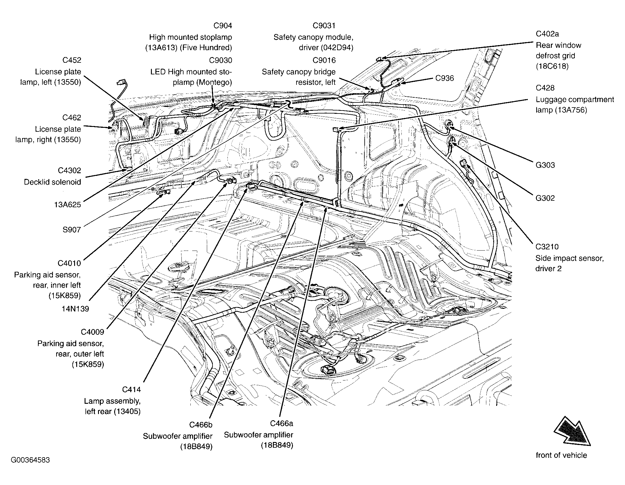 Parking Aid Module (PAM) (Five Hundred & Montego) Center front of trunk. See Figure.