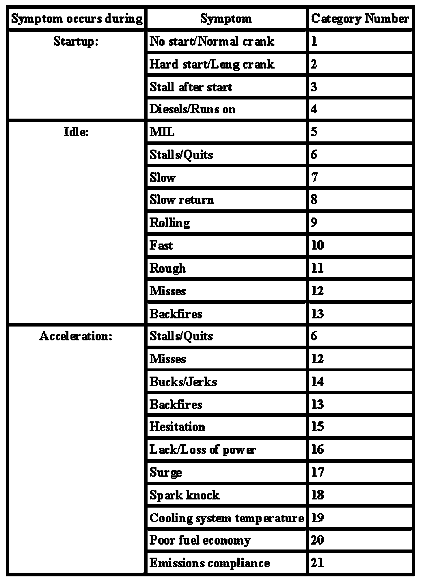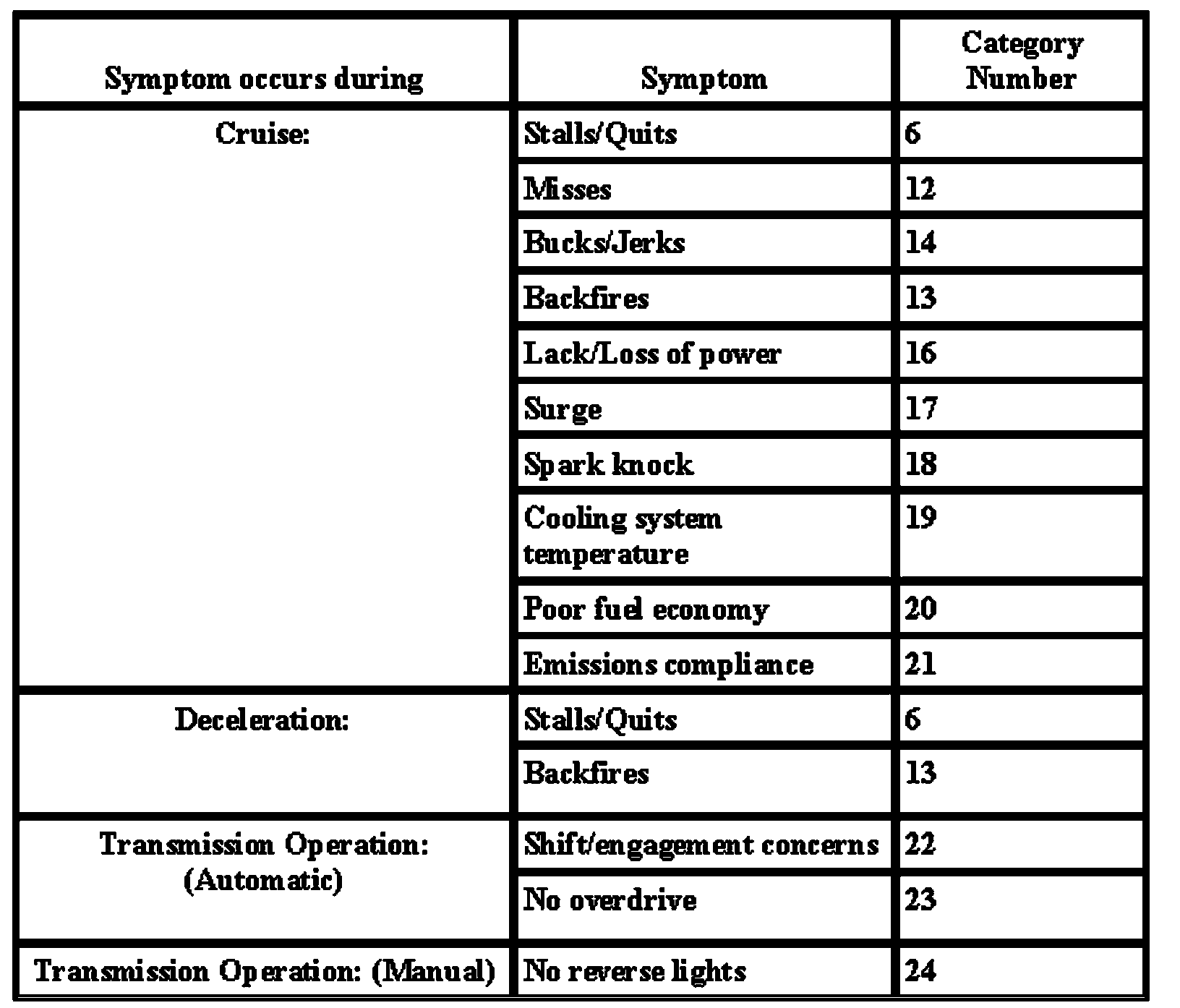 The Reference Value Symptom Chart is used to provide guidance in selecting the appropriate PID or measured signal delated to the fault area. Select a symptom from the symptom chart along with the category number and go to the PID/Measured Signal Chart. For multiple symptoms, select symptom that is the mist evident.