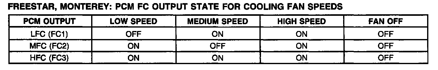 Freestar, Monterey: PCM FC Output State For Cooling Fan Speeds Chart: