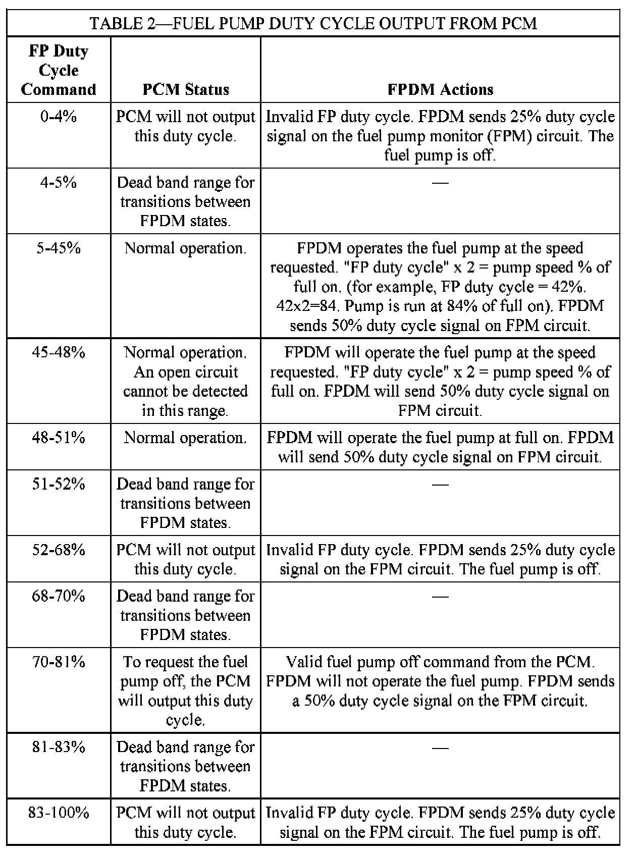 The fuel pump (FP) signal is a duty cycle command sent from the PCM to the FPDM (Table 2). The FPDM uses the FP command to operate the fuel pump at the speed requested by the PCM or to turn the pump off.