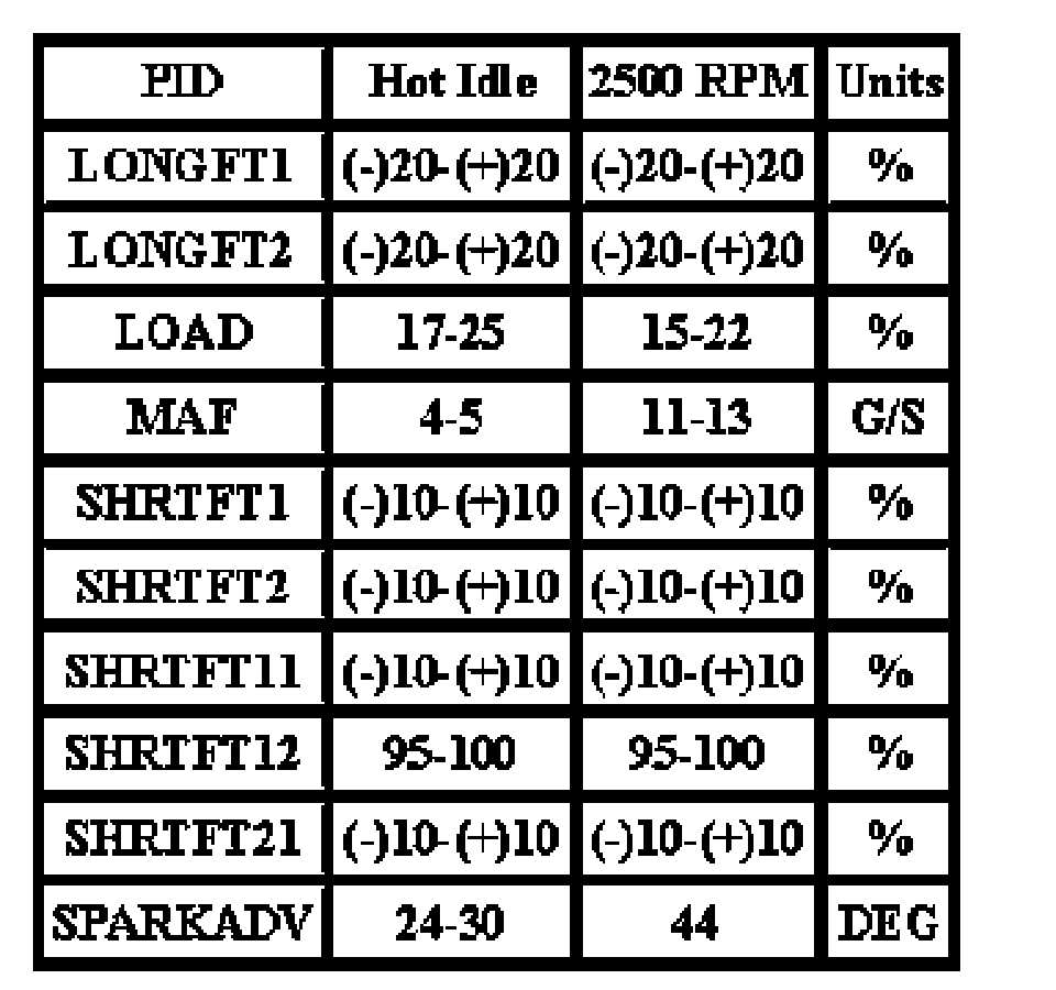 Note: All generic OBD readings under no load (PARK or NEUTRAL).