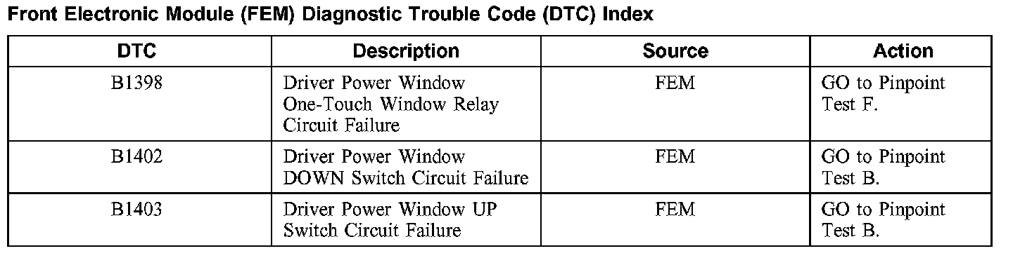Front Electronic Module (FEM) Diagnostic Trouble Code (DTC) Index
