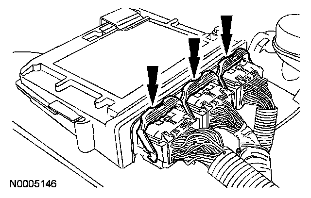 2. Release the clips and disconnect the 3 powertrain control module (PCM) electrical connectors.