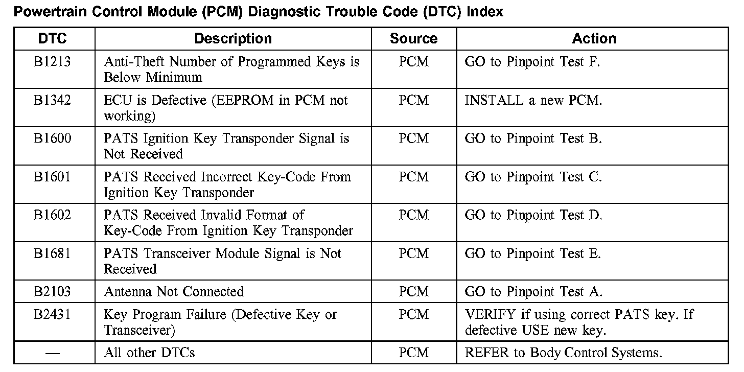 Powertrain Control Module (PCM) Diagnostic Trouble Code (DTC) Index