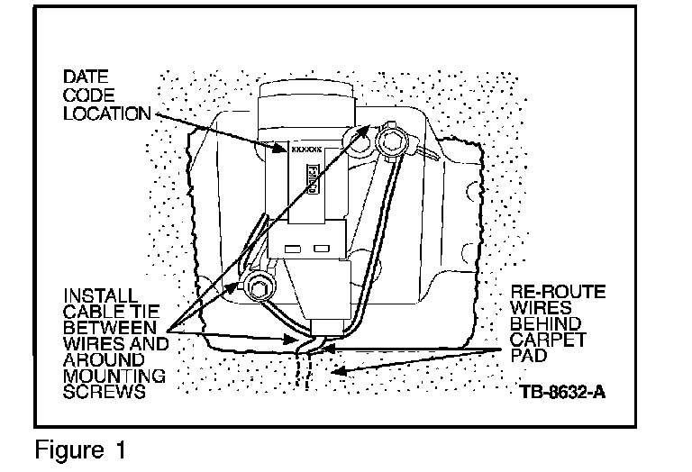 a. Format is Year (4=2004, 5=2005, 6=2006) Month (A=Jan, B=Feb, C=Mar "I" is not used) Day (1-31) Shift (X or Y). On all vehicles, reroute inertia switch wiring behind/under carpet pad and install cable tie over connector. (Figure 1)