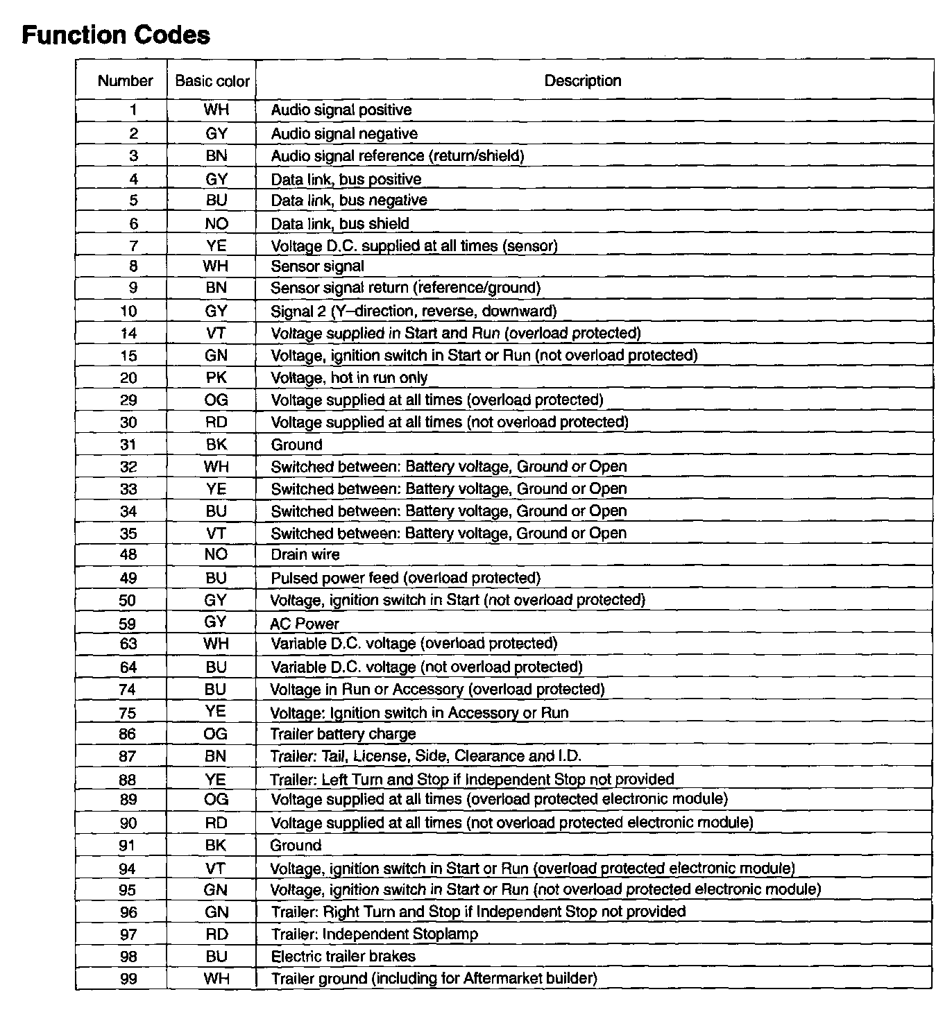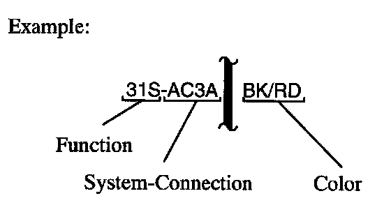 Each function code has a specific basic color associated with it, which can also be seen in the chart of function codes on the next diagram. The identification color is a colored stripe used to differentiate several wires with the same function within one component connector.