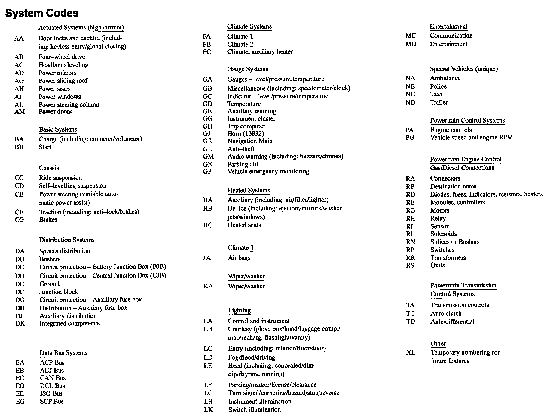 Systems are related to subsets of the vehicle circuitry. A complete list of the system codes are shown in System Codes Diagram.