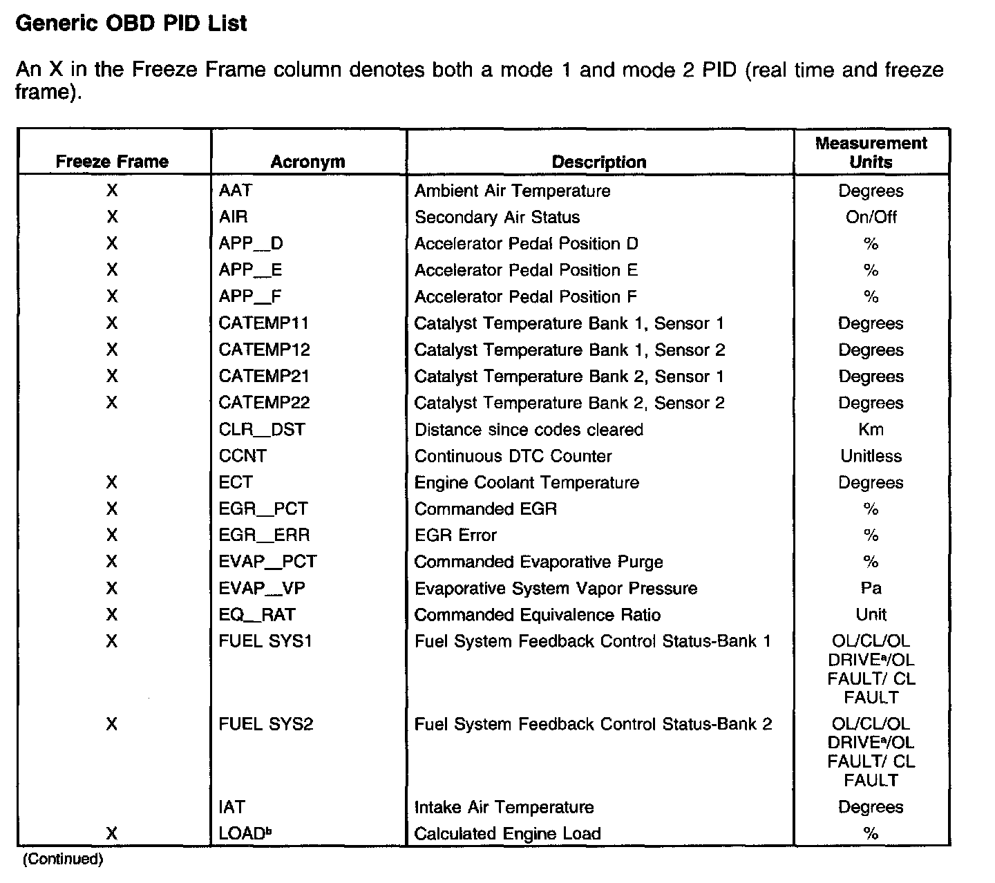 Generic OBD PID List (Part 2):
