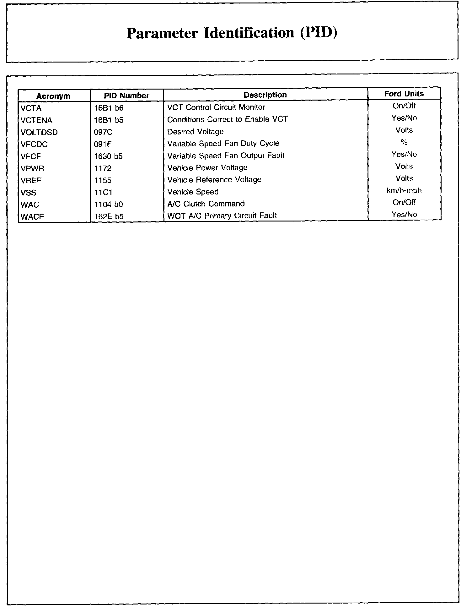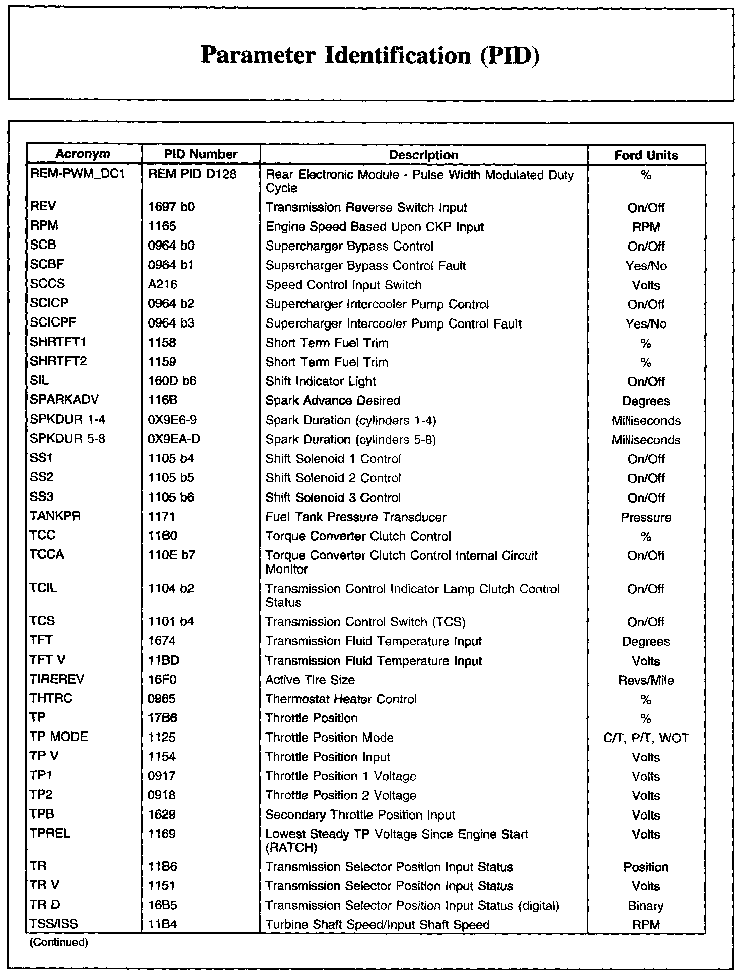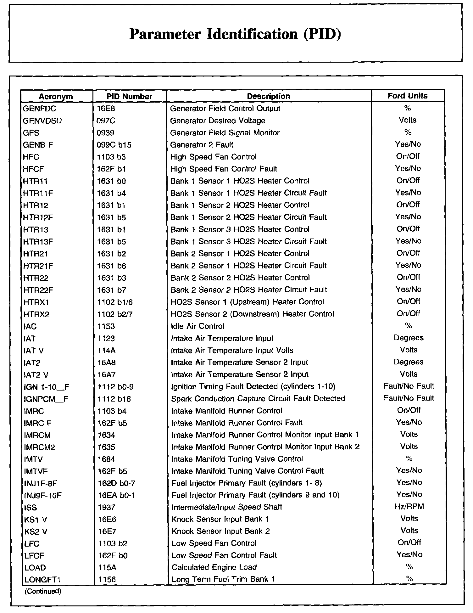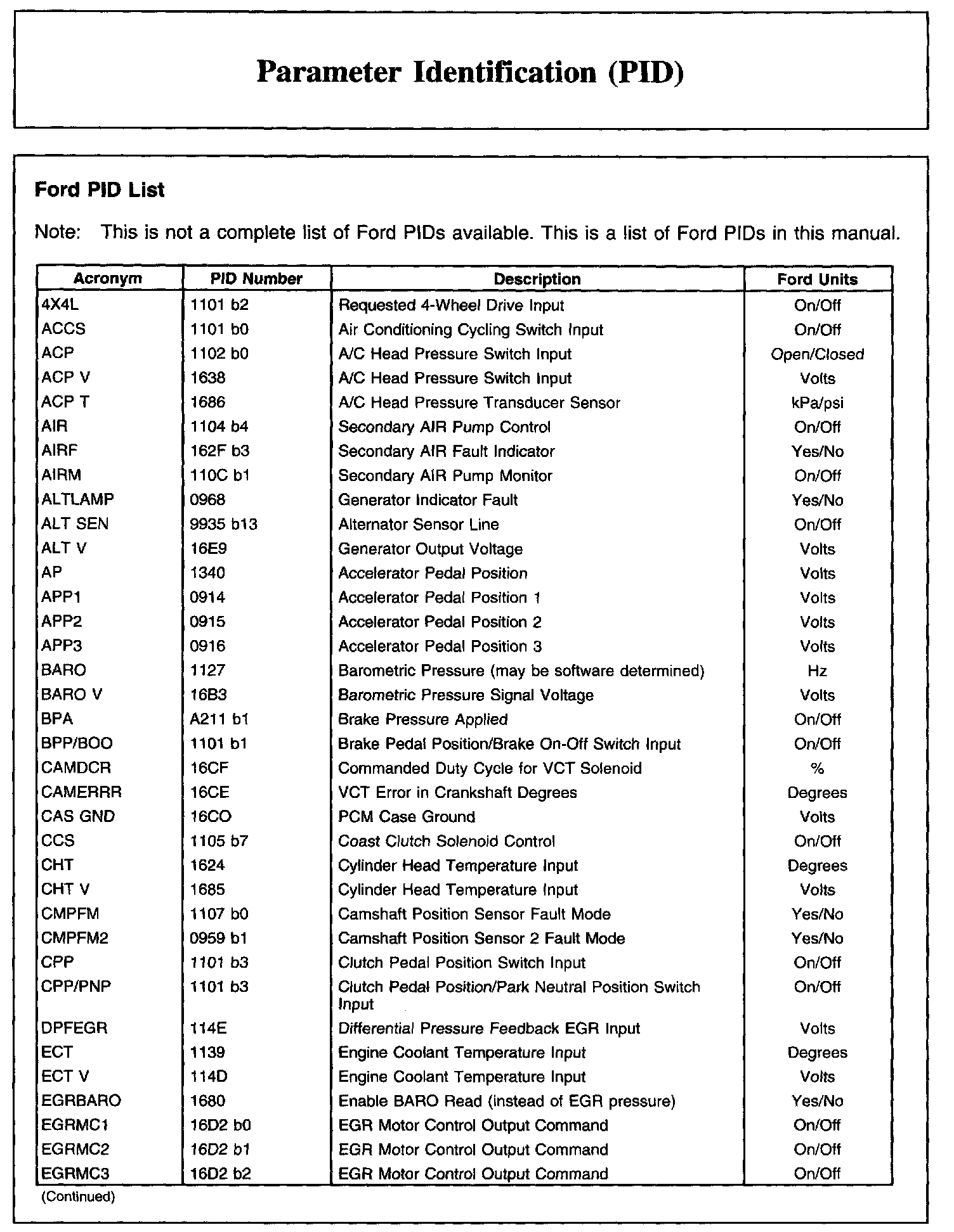 The parameter identification (PID) mode allows access to PCM information. This includes analog and digital signal inputs and outputs along with calculated values and the system status. There are two types of PID lists available and both are used. The first is the generic (J1979) OBD PID list. This is a standard set of PIDs that all diagnostic tools must be able to access. The second is a Ford specific (J2190) list which can be accessed by an appropriate diagnostic tool. When accessing any of these PIDs, the values will be continuously updated. The generic or Ford PID list provides definitions and values in appropriate units. For more information, refer to the Society of Automotive Engineers (SAE) document J2205.