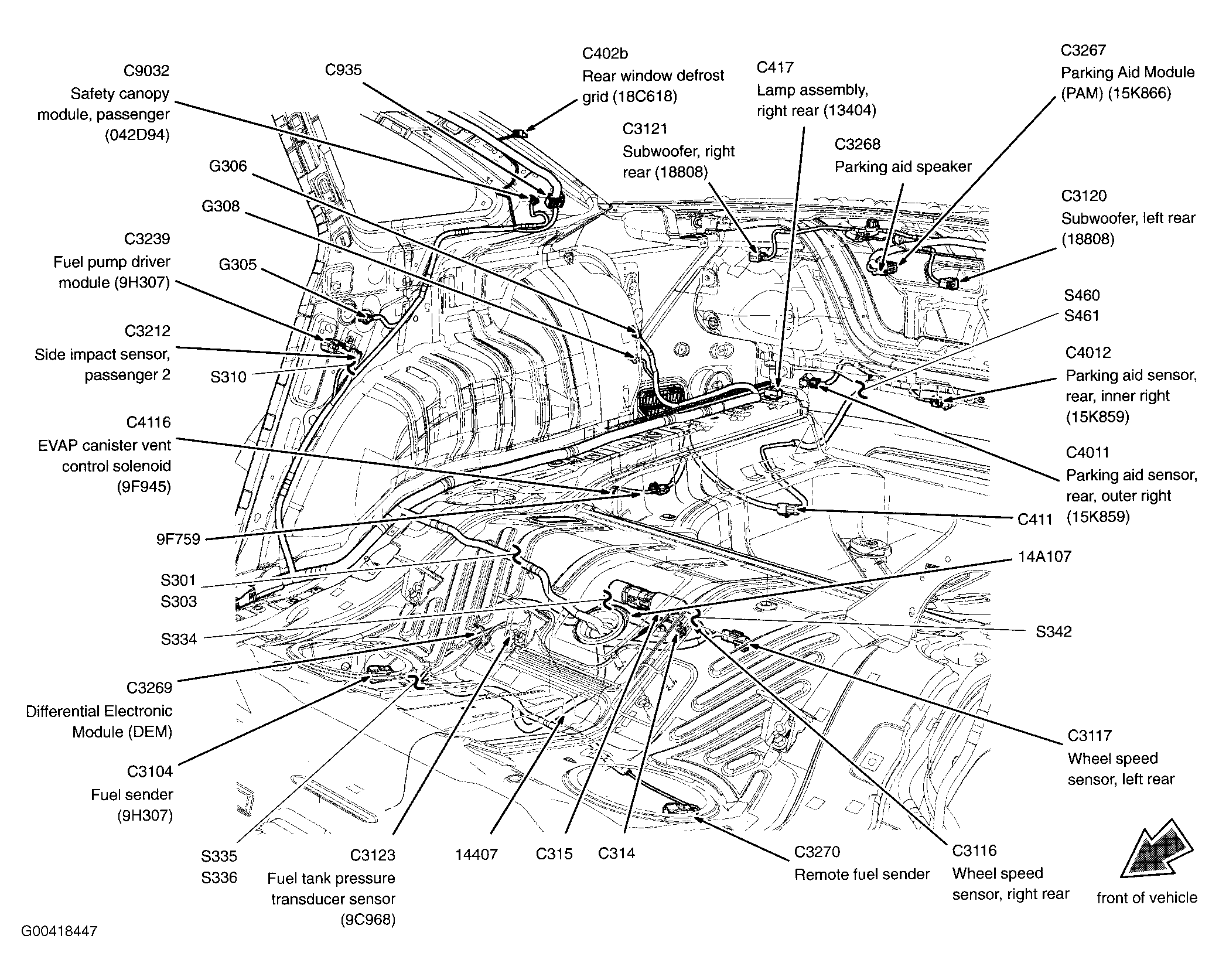 | Parking Aid Module (PAM) (Five Hundred & Montego) | Center front of trunk on package tray trim panel. See Figure and Figure. |