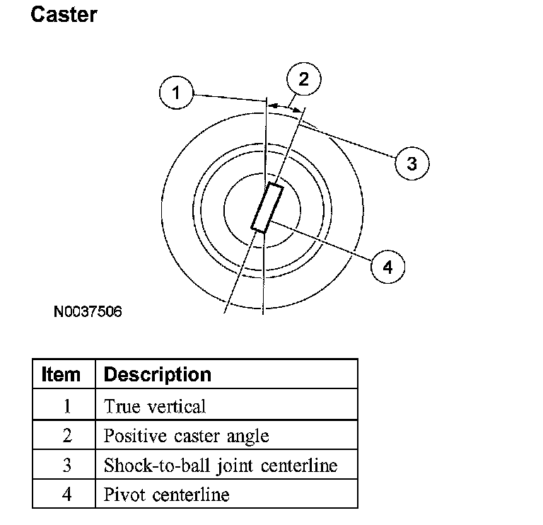 Caster is the deviation from vertical of an imaginary line drawn through the ball joints when viewed from the side. The caster specifications will give the vehicle the best directional stability characteristics when loaded and driven. The caster setting is not related to tire wear.