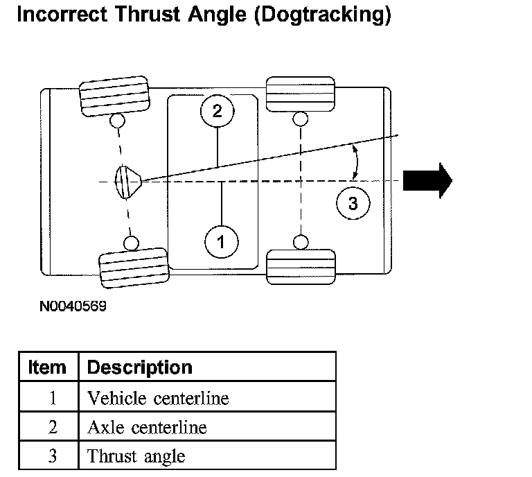 Incorrect thrust angle (dogtracking) is the condition in which the rear axle is not square to the chassis. Heavily crowned roads can give the illusion of dogtracking.