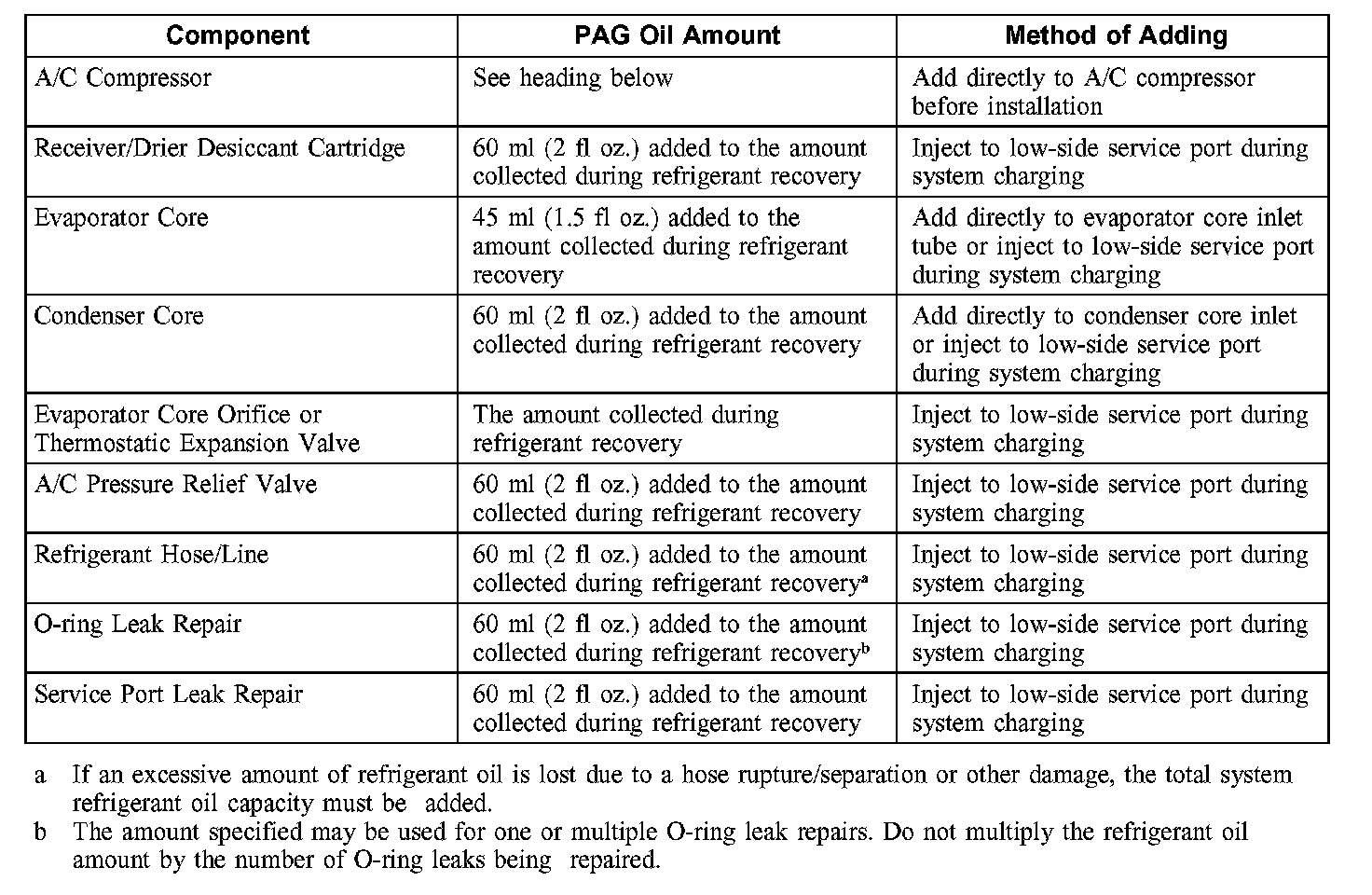 CAUTION: During normal A/C operation, oil is circulated through the system with the refrigerant, and a small amount is retained in each component. If certain components of the system are removed, some of the refrigerant oil will go with the component. To maintain the original total oil charge, it is necessary to compensate for the oil lost by adding oil to the system with the new part.