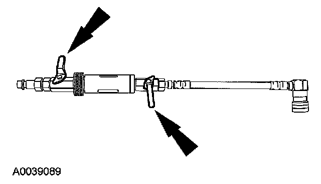 5. Install the dye/lubricant injector between the low-side service gauge port valve and the refrigerant service station or manifold gauge set.