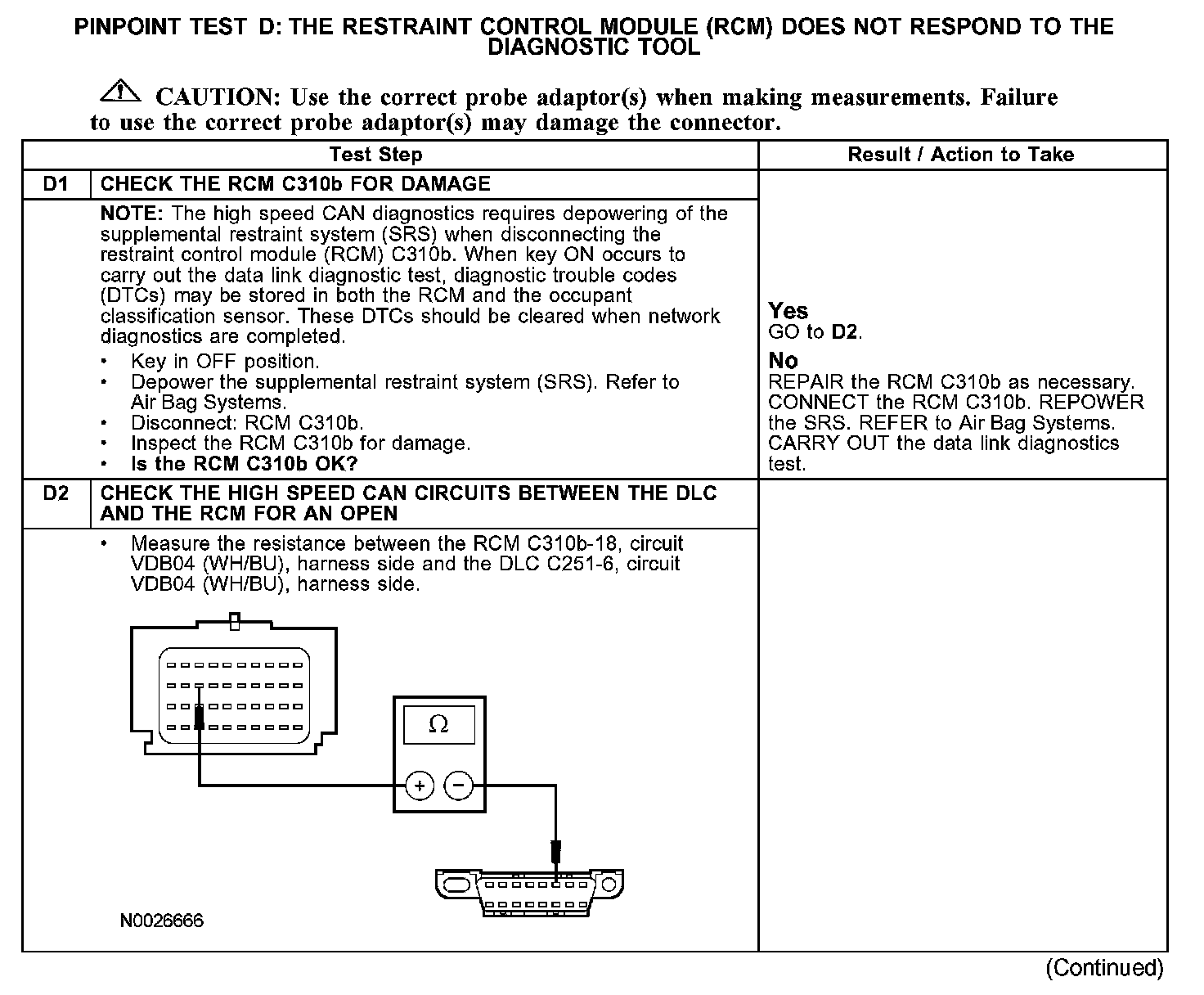 Home >> Ford >> 2006 >> Fusion L4-2.3L VIN Z >> Repair and Diagnosis >> Powertrain Management >> Computers and Control Systems >> Information Bus >> Testing and Inspection >> Pinpoint Tests >> Test D: The Restraint Control Module (RCM) Does Not Respond To The Diagnostic Tool