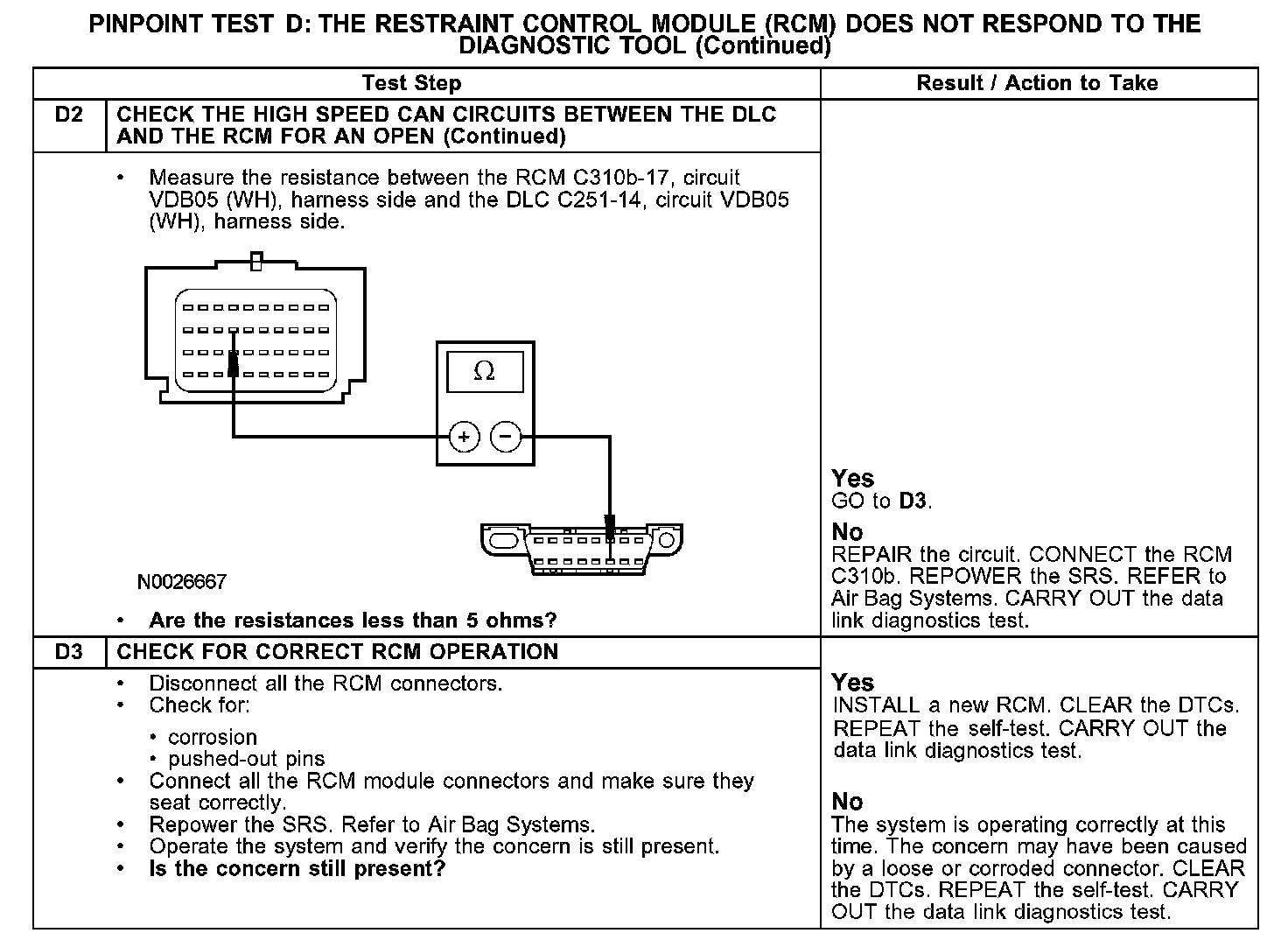 Check the high speed CAN circuits VDB04 (WH/BU) and VDB05 (WH) between the RCM C310b and the data link connector (DLC) C251. The total resistance values must not be more than 5 ohms. If the resistance is more than 5 ohms there is an open in one of the high speed CAN circuits, damage to the DLC C251, damage to the RCM C310b, or a problem in an in-line connector.