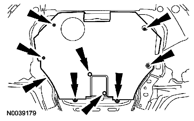 8. Remove the 6 pin-type retainers and the LH front structure to subframe splash shield.