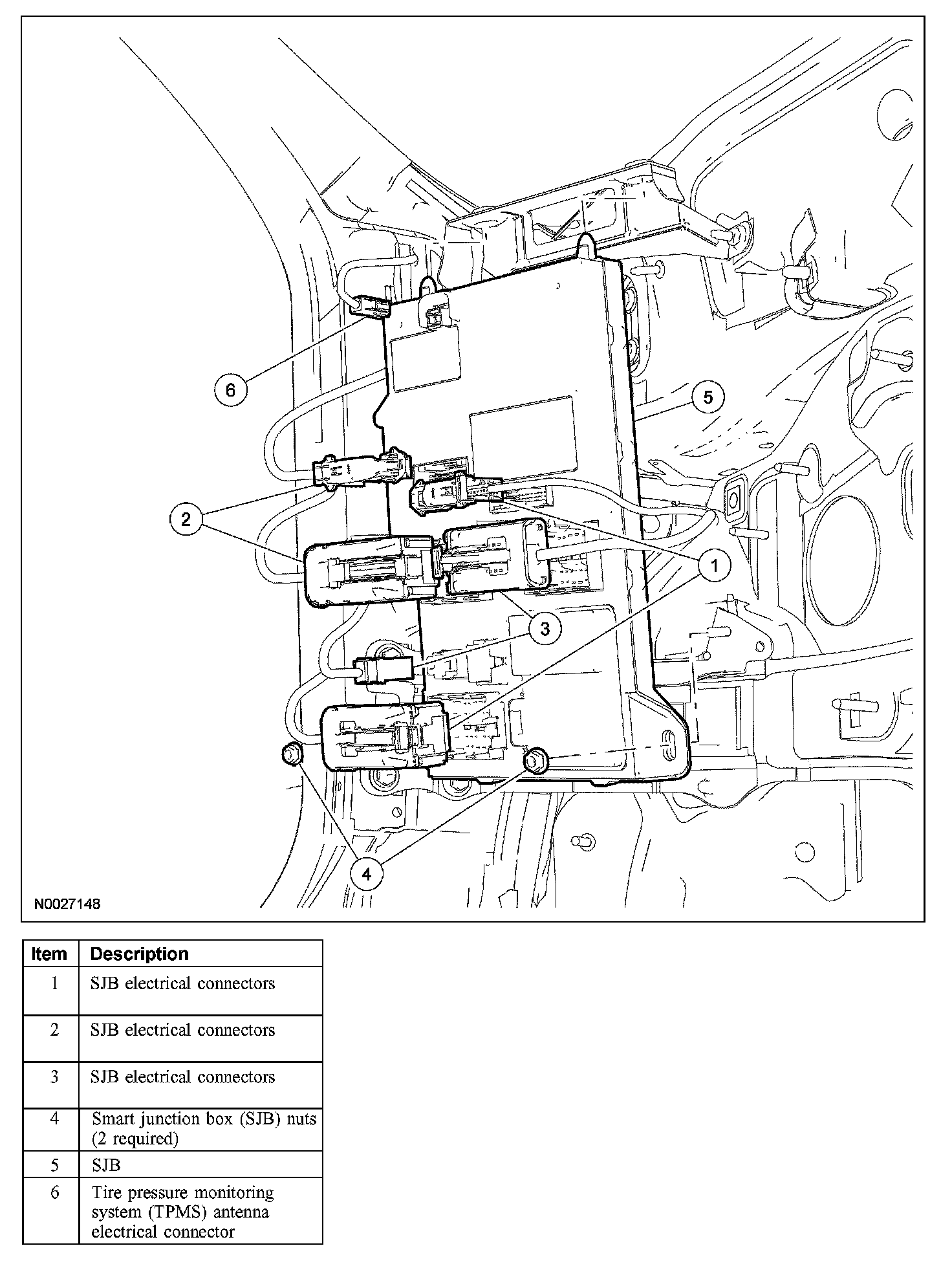 5. Disconnect the TPMS antenna electrical connector and remove the SJB.