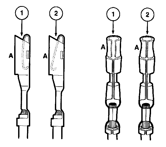 Any probe entering the terminal may enlarge the contact spring opening creating an intermittent signal. Insert the correct mating terminal (Location A) from the service kit and feel for a loose fit.