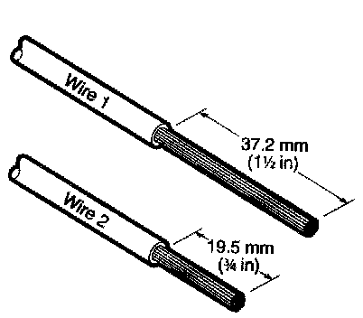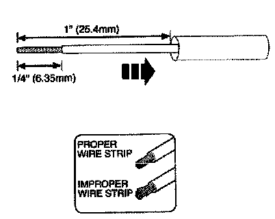 2. Strip 1/4" (6.35mm) of insulation from each wire end, taking care not to nick or cut wire strands.