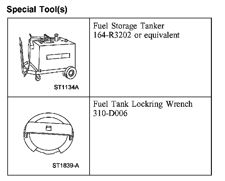 5. CAUTION: The fuel pump (FP) module and fuel level sensor will be below the fuel level in the tank when the tank is full. Make sure to drain 1/8 of the fuel capacity through the filler pipe prior to removing the pumps or fuel spillage will occur.