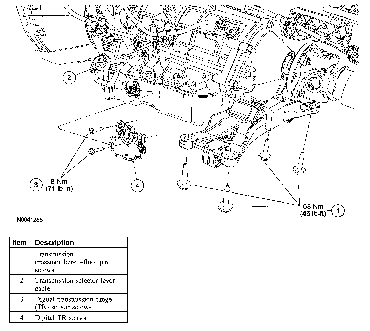 3. Remove the transmission crossmember-to-floor pan screws and lower the transmission enough to gain access to the TR sensor.