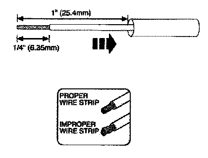 2. Strip 1/4" (6.35mm) of insulation from each wire end, taking care not to nick or cut wire strands.