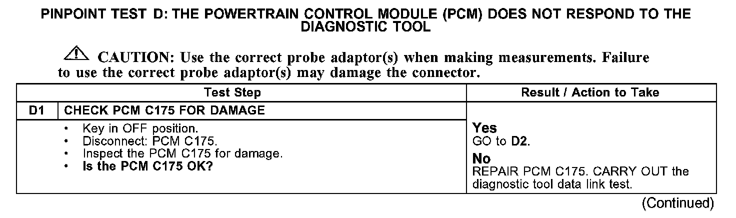 PINPOINT TEST D: THE POWERTRAIN CONTROL MODULE (PCM) DOES NOT RESPOND TO THE DIAGNOSTIC TOOLD1: