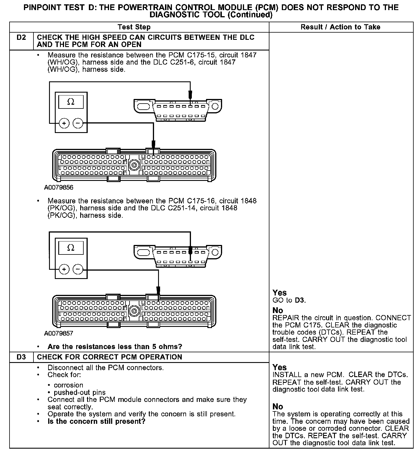 The PCM communicates with the diagnostic tool through the high speed controller area network (CAN), circuits 1847 (WH/OG) and 1848 (PK/OG). Check the high speed CAN, circuits 1847 (WH/OG) and 1848 (PK/OG), between the PCM C175 and the data link connector (DLC) C251. The total resistance values must not be more than 5 ohms. If the resistance is more than 5 ohms there is an open in one of the CAN circuits, damage to the DLC C251, damage to the PCM C175, or a problem in an in-line connector.