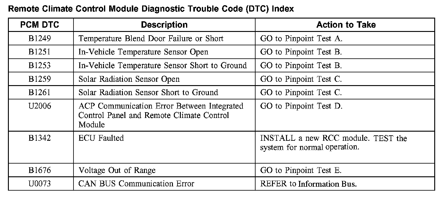 Remote Climate Control Module Diagnostic Trouble Code (DTC) Index