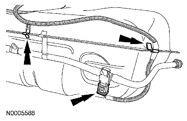 2. Disconnect the pressure transducer electrical connector on the top rear corner of the fuel tank and release the 2 harness retainers from the tank.