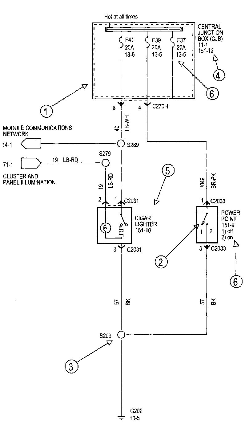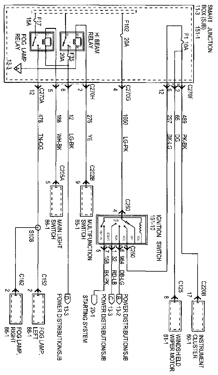 Each set normally starts with the component that powers the circuit, such as a fuse or the ignition switch. Current flow is shown from the power source at the top of the diagram to ground at the bottom of the diagram. A full representation of the power supply of a fuse or the power distribution from a fuse to various components is given in the Power and Ground Distribution Diagrams. Full representation of the ground connections are shown in the Power and Ground Distribution Diagrams.