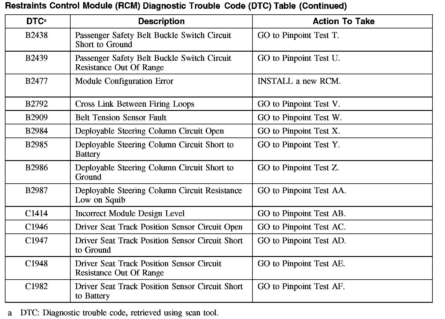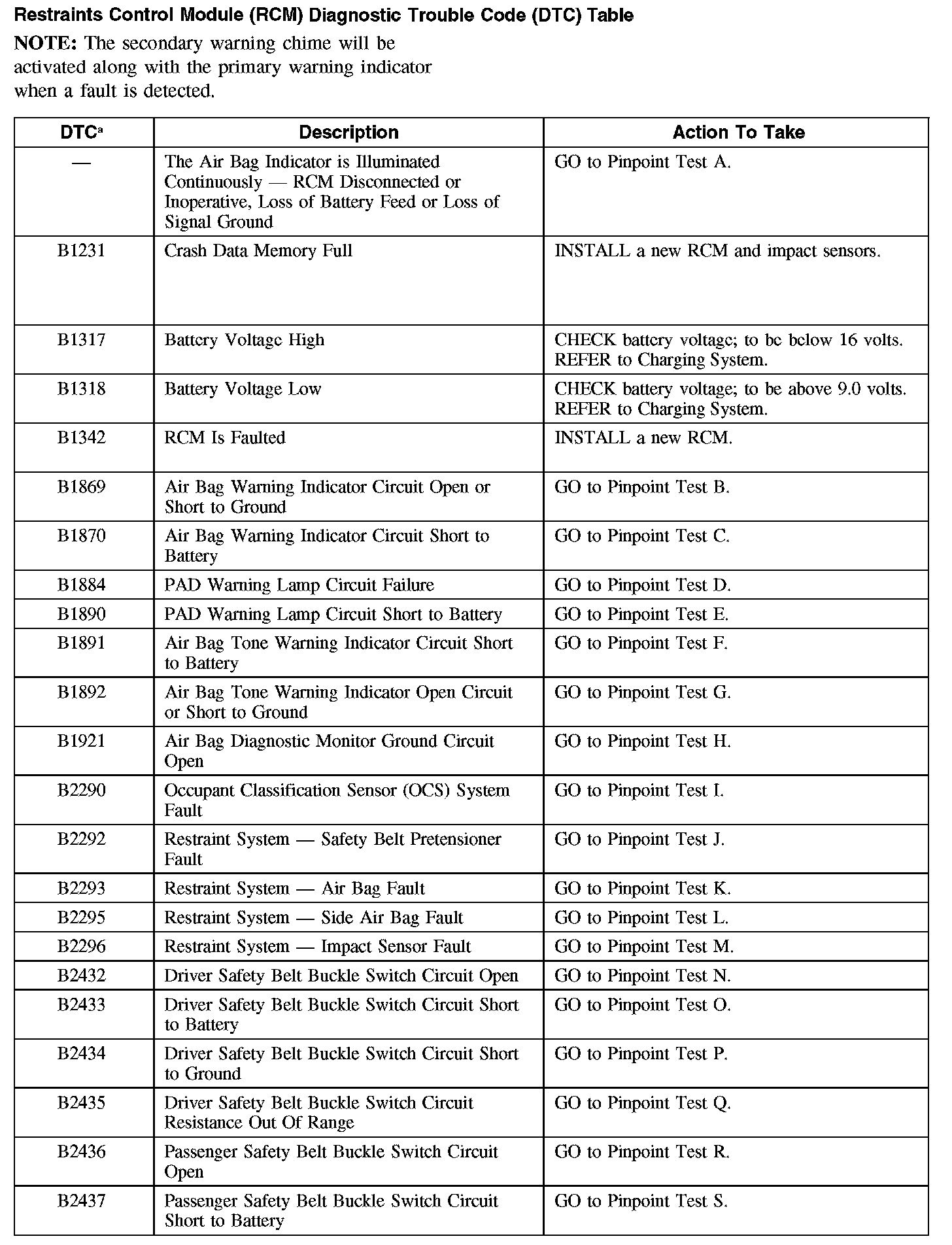 Restraints Control Module (RCM) Diagnostic Trouble Code (DTC) Table