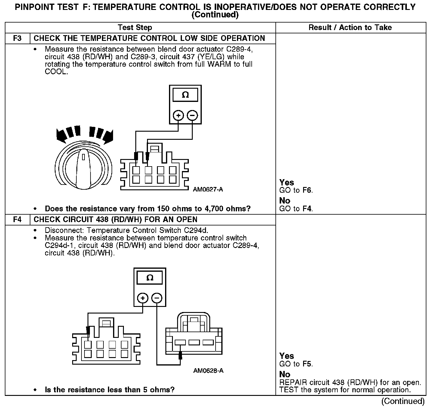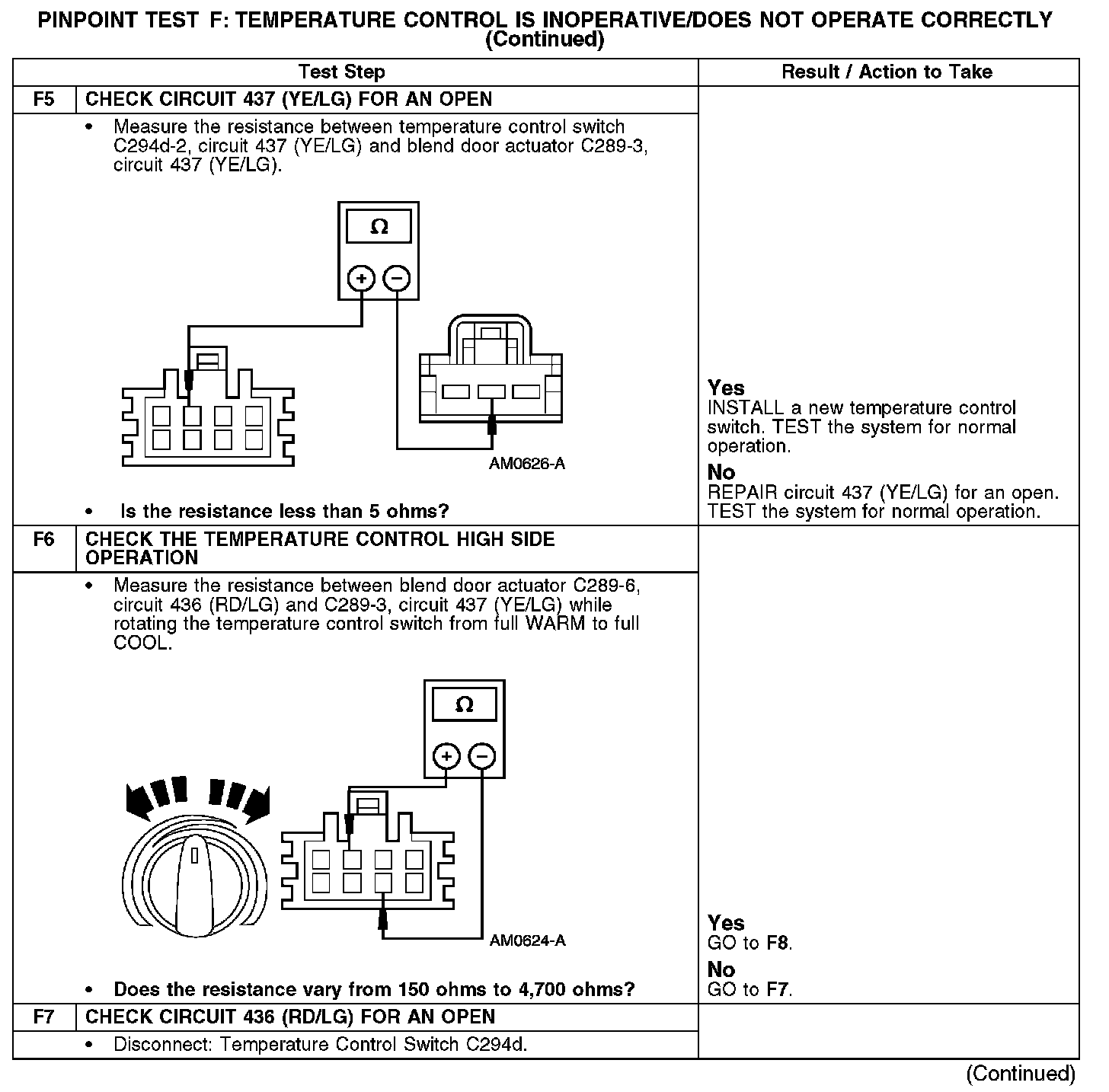 Under normal operation, the temperature blend door actuator is supplied voltage on circuit 489 (PK/BK) and ground on circuit 57 (BK). As the temperature selection changes it varies the voltage on circuit 437 (YE/LG) to the temperature blend door actuator. The temperature control potentiometer receives reference voltage from the temperature blend door actuator through circuit 436 (RD/LG). Ground for the temperature control potentiometer is supplied from the temperature blend door actuator through circuit 438 (RD/WH).