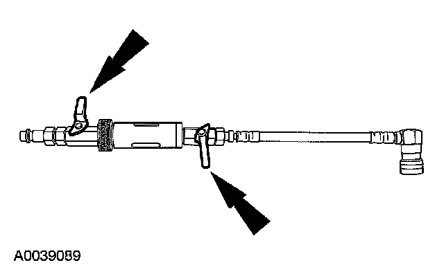 5. Install the dye/lubricant injector between the low-side service gauge port valve and the refrigerant service station or manifold gauge set.
