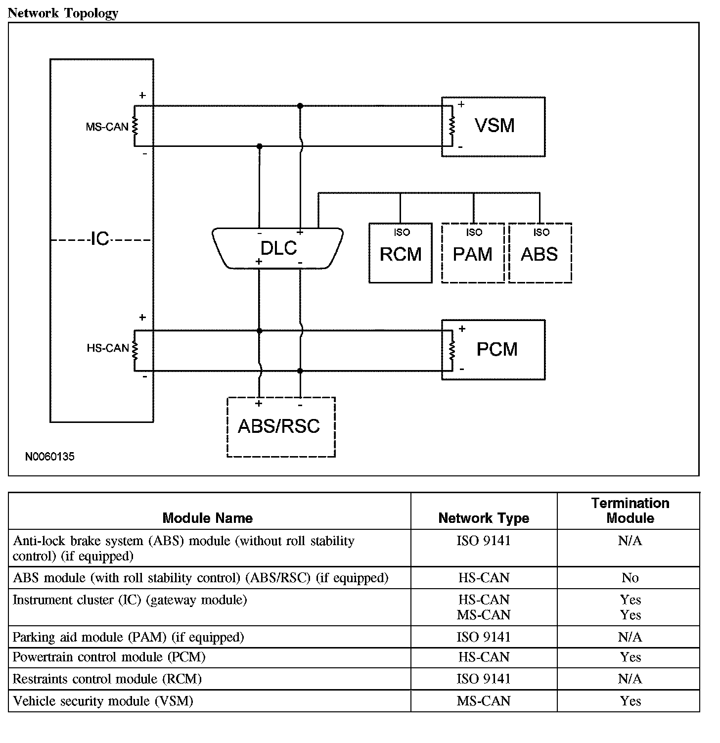 The instrument cluster is the gateway module, translating HS-CAN to MS-CAN and vice versa. This information allows a message to be distributed throughout both networks. The instrument cluster is the only module on this vehicle that has this ability.