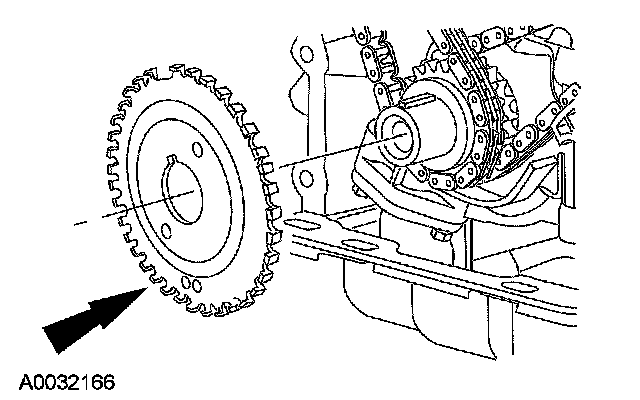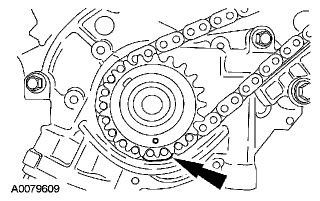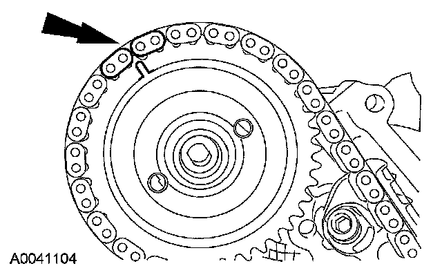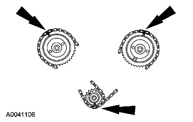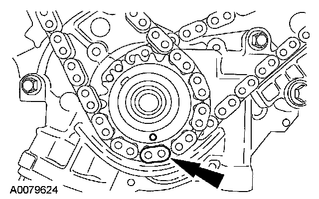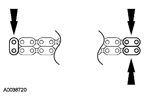 Install the LH timing chain on the camshaft sprocket with the 2 chain (marked) links and the timing marks aligned.