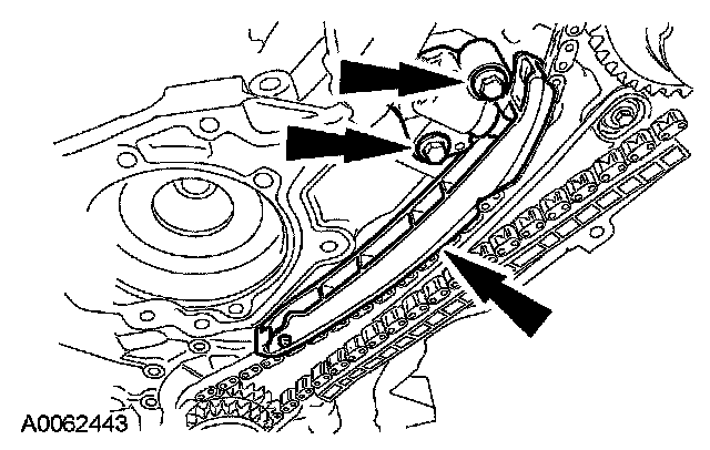 Remove the 2 bolts, the LH timing chain tensioner and tensioner arm.