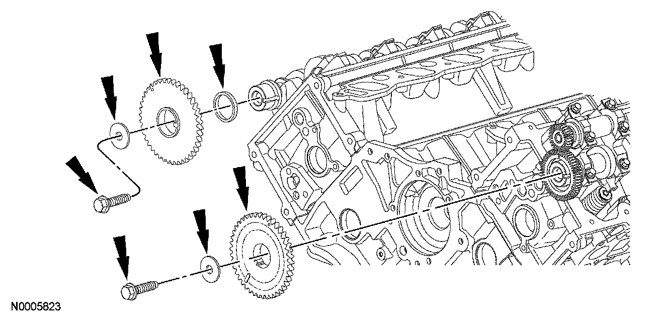 11. Remove the 2 bolts, flat washers, camshaft sprockets and RH camshaft spacer.