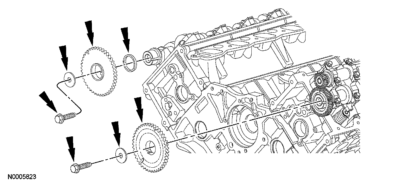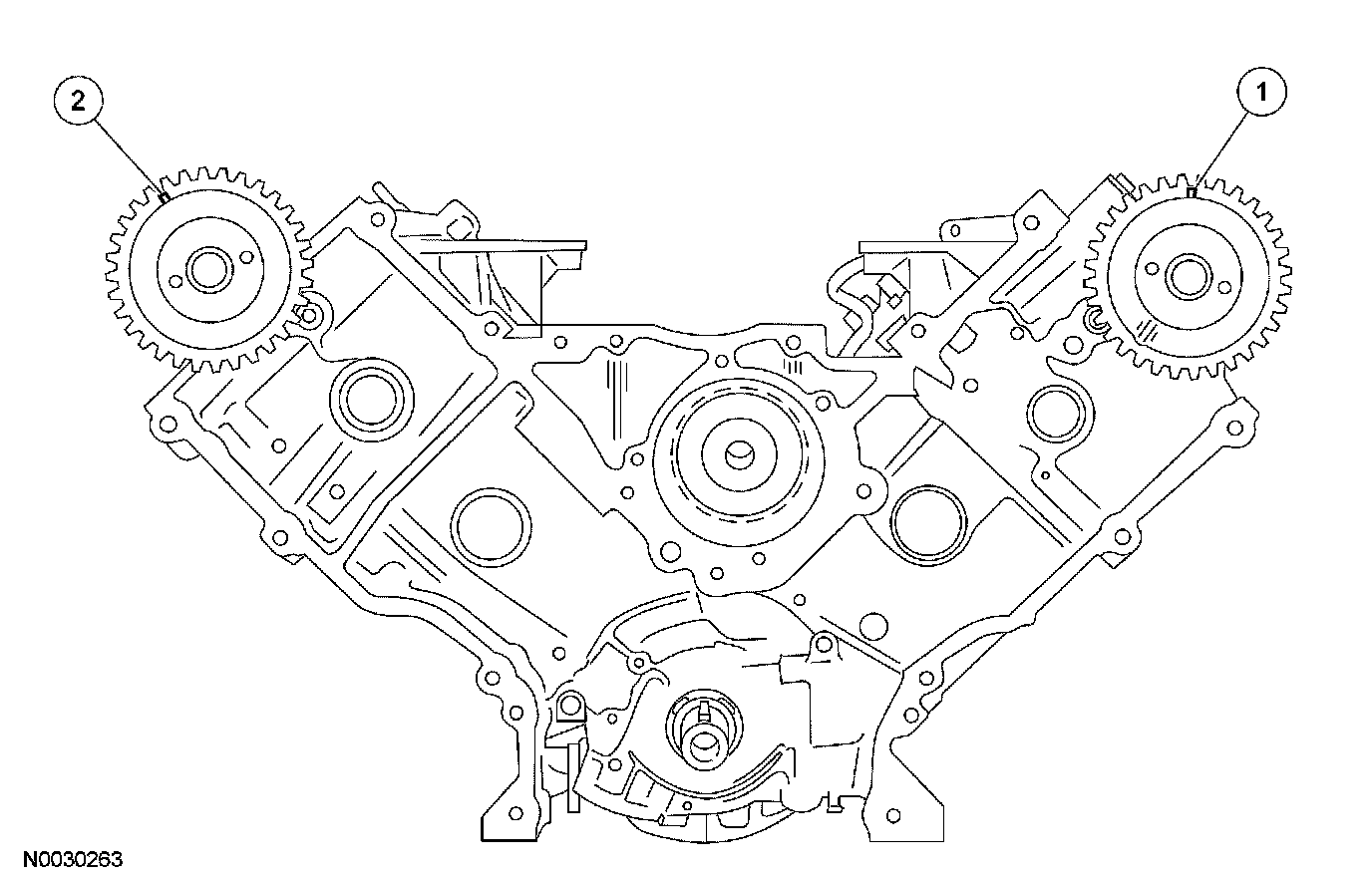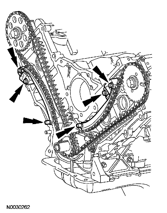 5. CAUTION: Unless otherwise instructed, at no time when the timing chains are removed and the cylinder heads are installed may the crankshaft or camshaft be rotated. Severe piston and valve damage will occur.