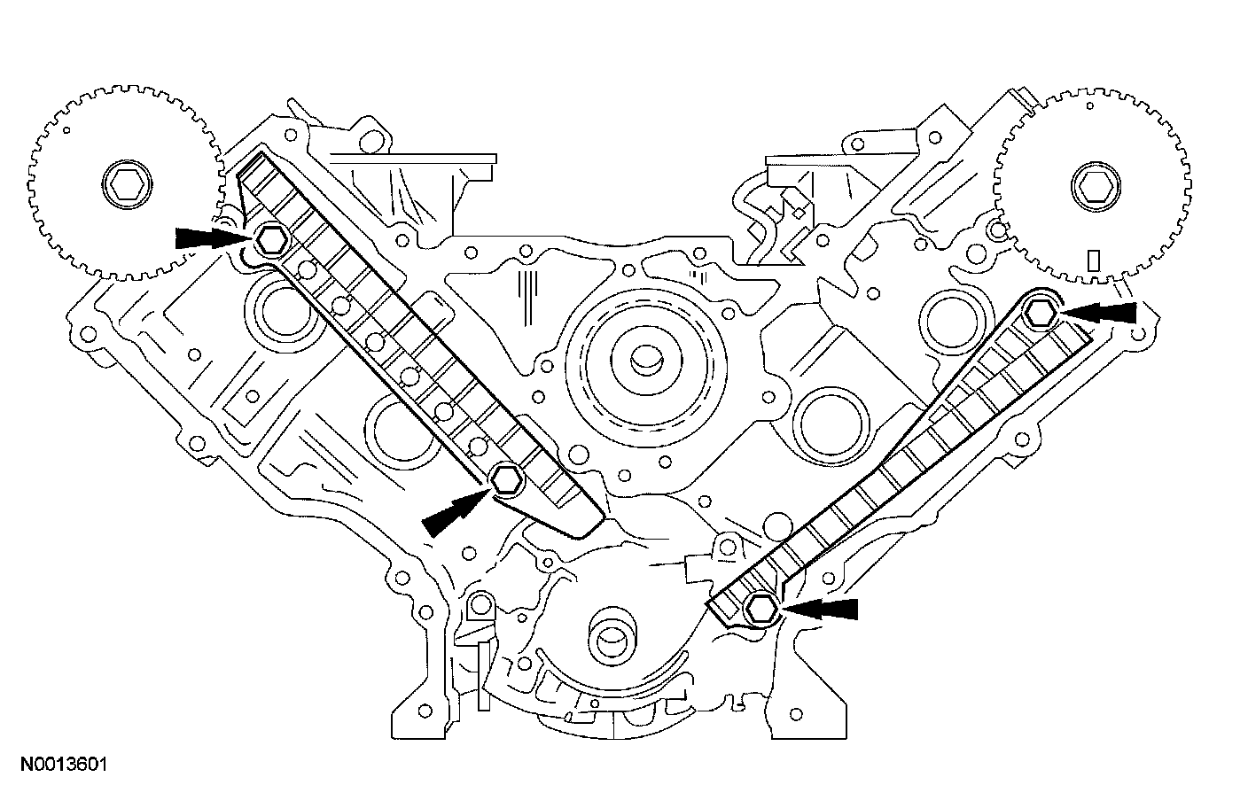 Position the LH and RH timing chain tensioner arms on the dowel pins and install the timing chain tensioners and the 4 bolts.